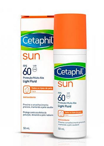 Para Que Serve:Sun Light Fluid Fps 60 Sem Cor Cetaphil: 37% de aumento no efeito antioxidante em apenas 2 semanas, através da vitamina C, vitamina E e Complexo CelligenAlta proteção FPS 60 UVA/UVB e Infravermelho. Previne o envelhecimento cutâneo, protege a pele contra partículas de poluição e auxilia no reparo do DNA da célula.Modo de Usar:Aplicar generosamente antes da exposição ao sol. Reaplicar sempre, após sudorese intensa, nadar ou banhar-se, secar-se com toalha e durante a exposição ao sol