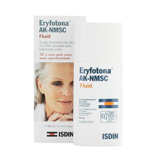 Para Que Serve:O ISDIN Eryfotona AK-NMSC é um protetor solar fluido que ajuda a prevenir e a reduzir o risco do dano actínico na pele causado pelo sol. Cria uma película protetora de Repairsomes sobre a pele, que ajuda a prevenir o dano do DNA celular causado pela exposição solar. Adicionalmente ajuda a reduzir o risco do dano actínico, graças ao seu conteúdo Repairsomes (fotoliase e filtros UV). O Eryfotona AK-NMSC cria um filme protetor sobre a pele que previne de novas lesões. Por exemplo, naquelas pessoas que fizeram tratamento contra ceratose actínica, o produto se demonstrou eficaz, reduzindo pela metade a probabilidade de recaída. Exclusiva fórmula que, através do calor e da fricção durante a aplicação, se torna mais fluida e se funde com a pele. Possui proteção UVB 99 e UVA 38,8 e é indicado para todos os tipos de pele.Modo de Usar:Aplicar generosamente duas vezes ao dia (no início da manhã e ao meio dia, pois a fotoliase se ativa com a luz visível) nas áreas fotoexpostas (rosto, pescoço, colo, braços, mão, couro cabeludo) à luz solar. Em caso de exposição solar, é necessária a reaplicação do produto para manter a sua efetividade. Reaplicar sempre após sudorese intensa, nadar ou banhar-se, secar-se com toalha e durante a exposição ao sol.