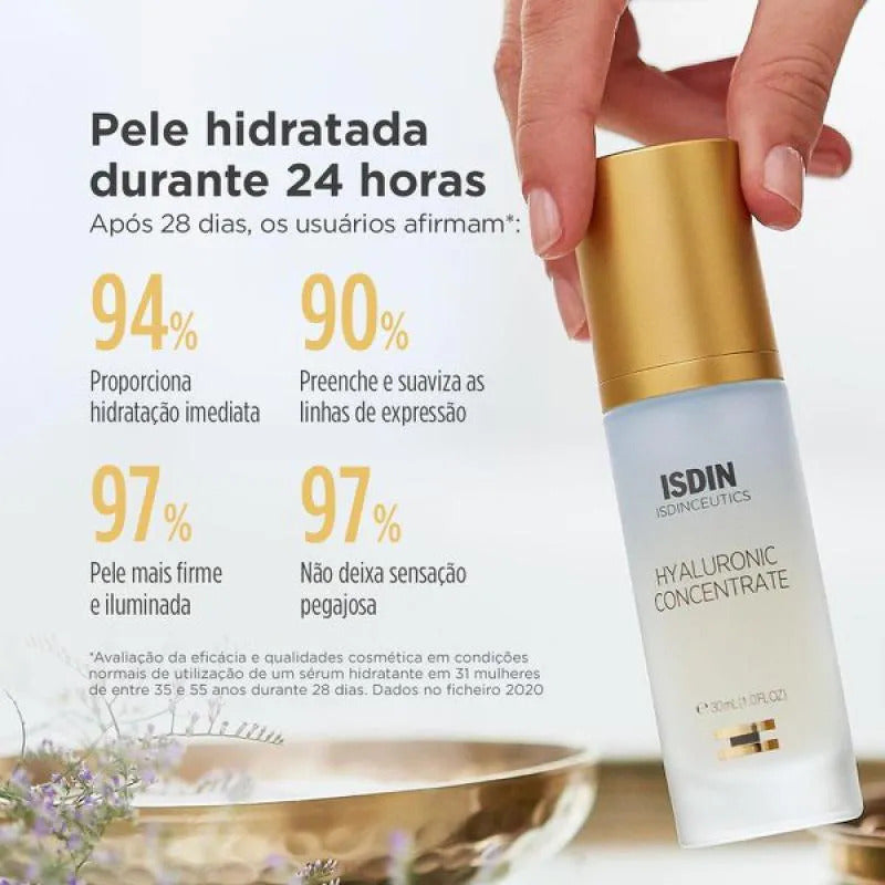 Para Que Serve:Hyaluronic Concentrate é um sérum a base de ácido hialurônico que hidrata, redensifica e minimiza rugas. Sua textura water-gel é ideal para todos os tipos de pele, inclusive oleosas. Apto para pele sensível. Duplo ácido hialurônico: promove hidratação superficial e profunda Extrato de Lens esculenta: reduz a aparência dos poros e limita a produção excessiva de sebo. Biomarine: ingrediente de origem marinha que possui propriedades antiaging e mantém a pele firme e hidratada. Matrikinas: estimulam a síntese de colágeno e ácido hialurônico, dando firmeza e suavidade para a pele.Modo de Usar:Aplicar de manhã e à noite na pele limpa e seca do rosto, pescoço e região do colo como primeiro passo da sua rotina, seguido dos seus produtos habituais para o cuidado da pele.