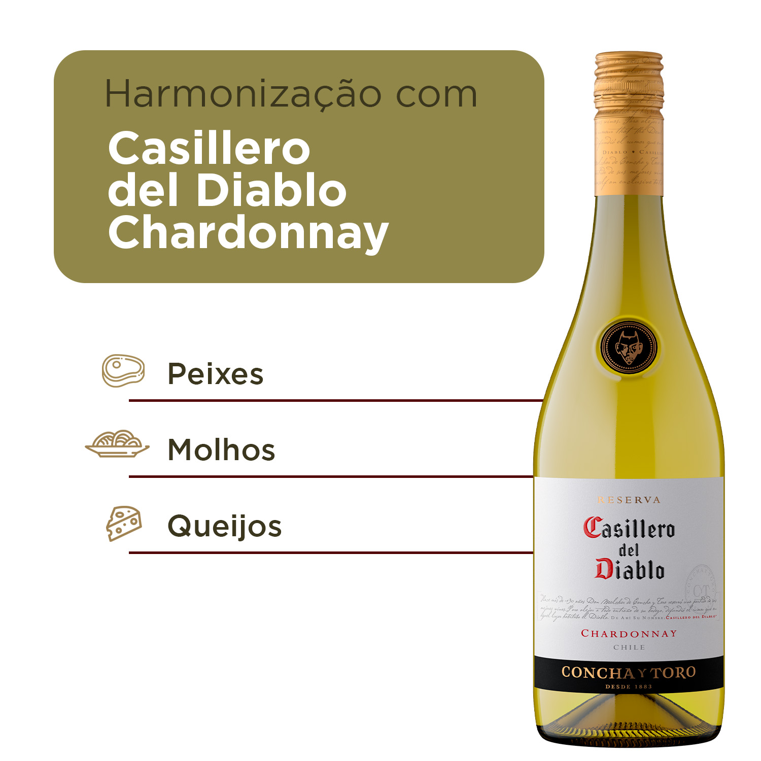 Vinho de excelência com Casillero del DiabloRefrescante e elegante, este Vinho Casillero Del Diablo Chardonnay chileno revela um perfil frutado envolvente, com notas sutis de tostado.Cor vibrante.Amarelo claro com reflexos dourados e esverdeados, realçando sua vivacidade e frescor.Aromas frutados.Notas marcantes de abacaxi e pêssego maduro, com toques de avelã que trazem elegância.Paladar fresco.Estrutura equilibrada, com acidez, pera verde e um final seco com notas sutis de tostado.Harmonização delicada.Combina com peixes grelhados, como robalo e linguado, com molhos cremosos e alcaparras.A lenda do vinho.Nascido no Chile, Casillero Del Diablo une qualidade e sabores, tornando-se símbolo de autenticidade.Características:- Aroma de abacaxi e pêssego maduro com toques de avelã- Harmoniza com peixes grelhados, como robalo e linguado, com molhos cremosos e alcaparrasInformações Técnicas:- Volume: 750 ml- Tipo de vinho: Branco- Uva: Chardonnay- Origem: Chile