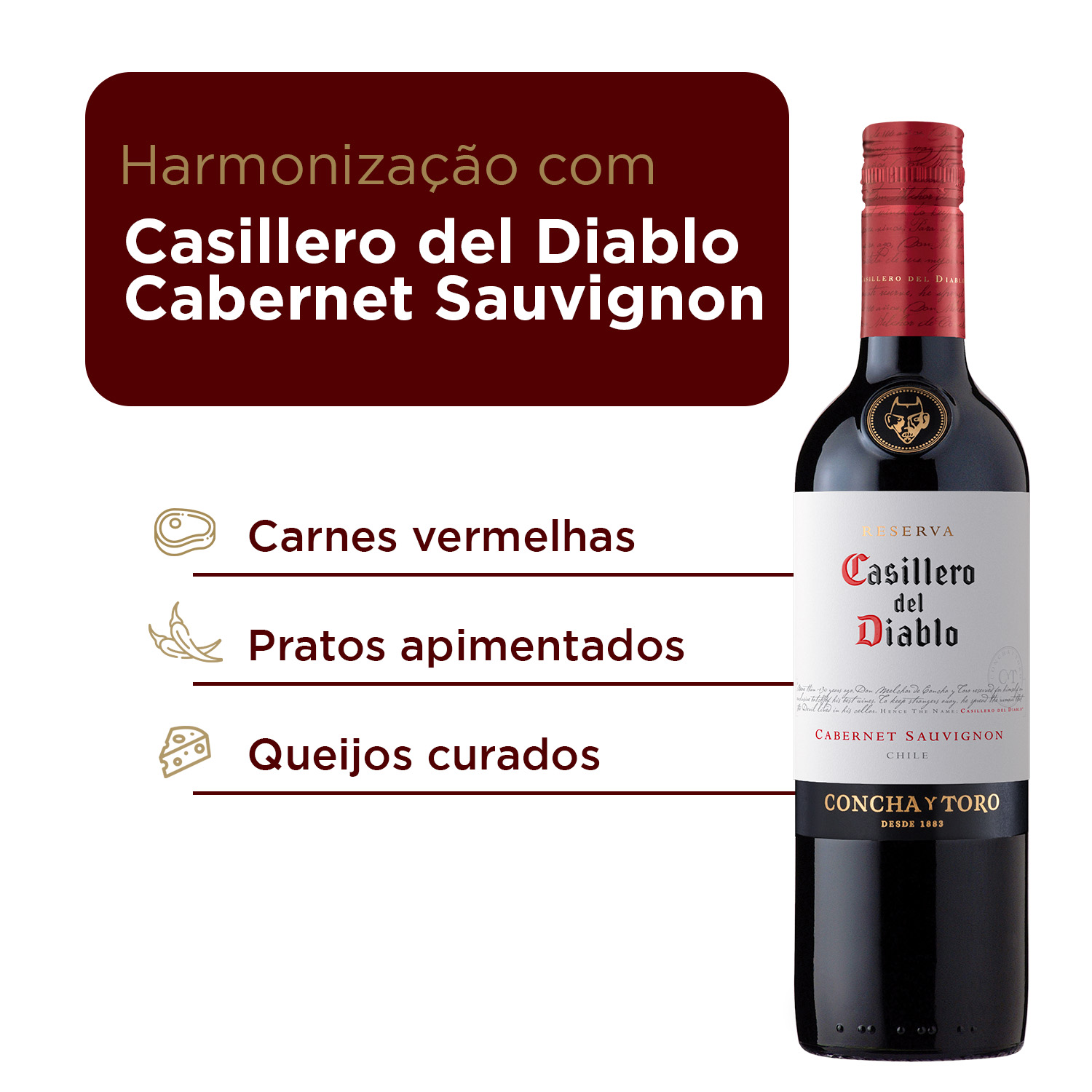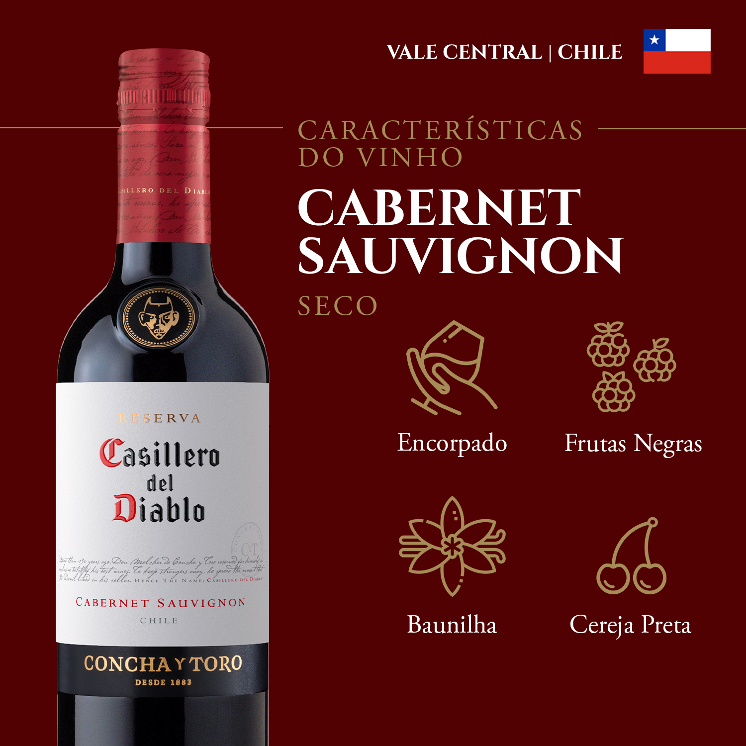 KIT 12 UNIDADES Vinho de excelência com Casillero del DiabloClássico e expressivo, este Vinho Chileno Casillero Del Diablo Cabernet Sauvignon revela a intensidade do Vale Central em cada gota, com equilíbrio e elegância.Cor intensa.Vermelho rubi profundo que antecipa a potência e complexidade do vinho.Aroma expressivo.Notas de cereja, groselha negra e ameixa, com um toque de carvalho tostado.Paladar envolvente.Taninos sedosos, frutas maduras e equilíbrio entre frescor e estrutura.Para momentos robustos.Harmoniza com carnes vermelhas, pratos apimentados e queijos curados.A lenda do vinho.Nascido no Chile, Casillero Del Diablo une qualidade e sabores, tornando-se símbolo de autenticidade.Características:- Aroma de cereja, groselha negra e ameixa, com um toque de carvalho tostado- Harmoniza com carnes vermelhas, pratos apimentados e queijos curadosInformações Técnicas:- Volume: 375 ml- Tipo de vinho: Tinto- Uva: Cabernet Sauvignon- Origem: Chile - Vale Central