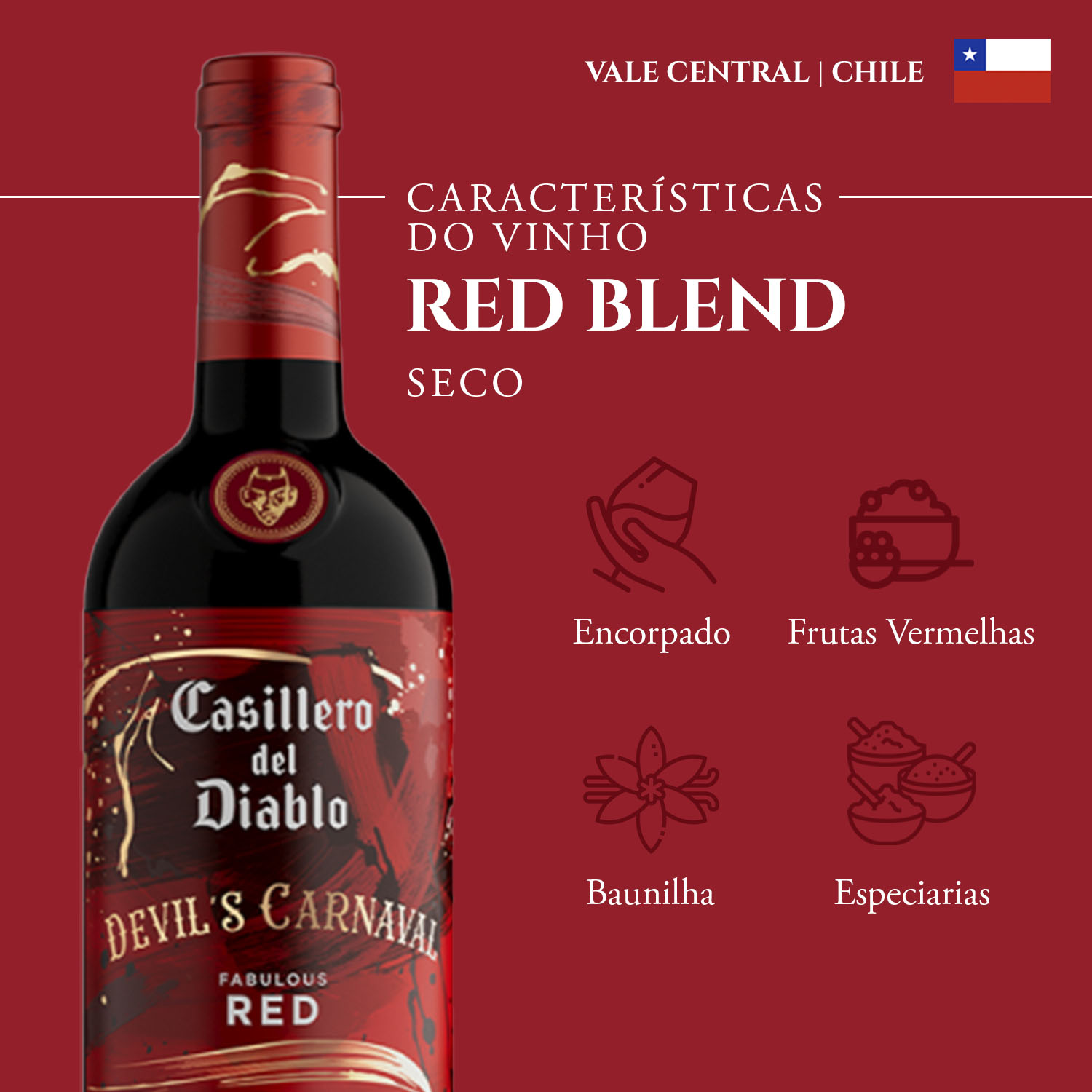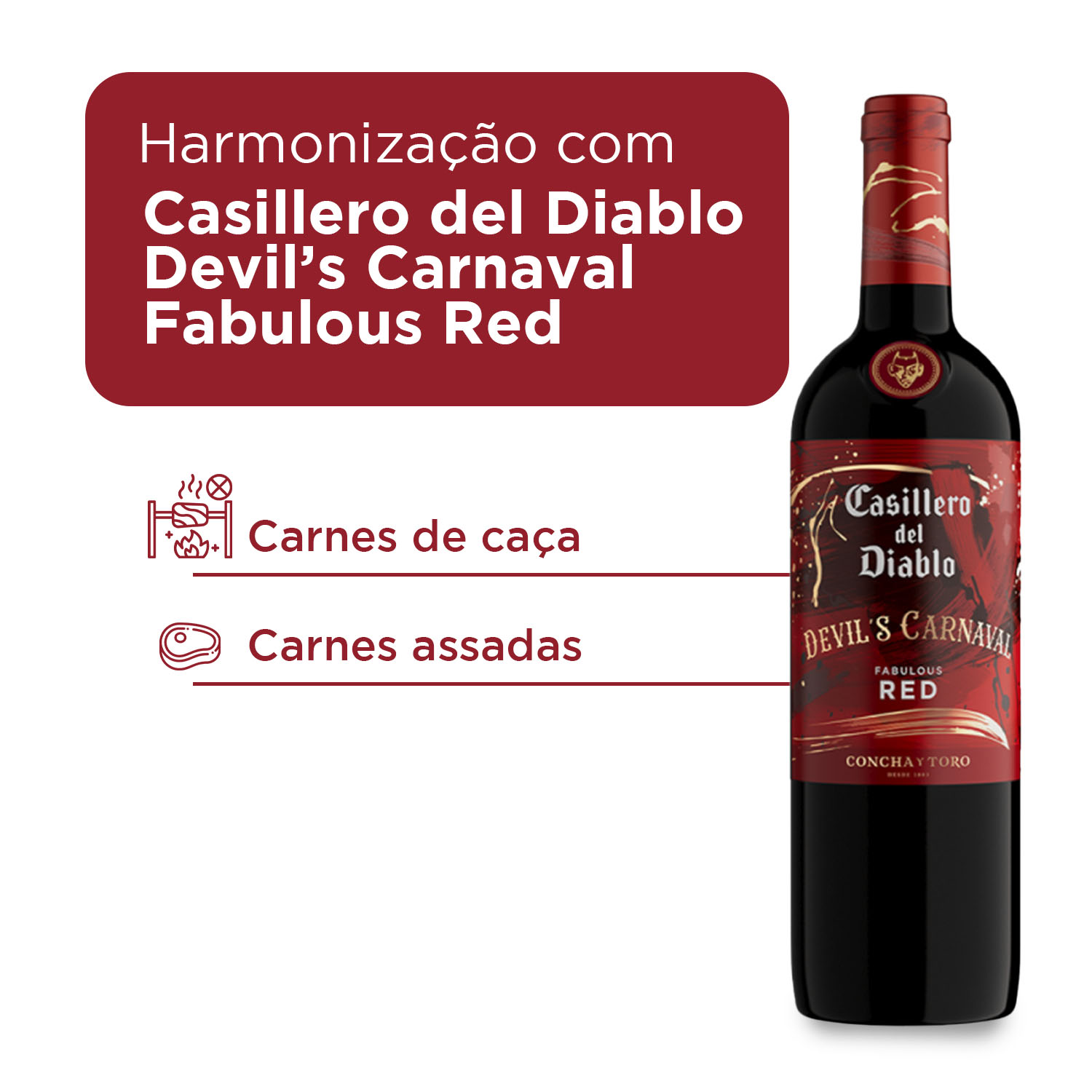 KIT UNIDADES 1 Casillero del Diablo Devil's Carnaval Vinho Tinto Chileno Fabulous Red 750 ml1 Casillero del Diablo Devil's Carnaval Vinho Tinto Chileno Spectacular Cabernet 750 mlDevil's Carnaval Fabulous Red: intensidade, frescor e personalidadeCom cor vibrante e intensa, esse blend Fabulous Red revela o estilo único e a personalidade marcante da linha Devil's Carnaval. Aromas fabulosos de ameixa criam uma experiência olfativa frutada, complexa e inesquecível, que convida a descobrir cada camada de seu perfil aromático.No paladar, apresenta textura macia e equilibrada, com taninos delicados e um final persistente, agradável e cheio de charme, que envolve e surpreende a cada gole.Casillero del Diablo Devil's Carnaval transforma qualquer ocasião em um brinde inesquecível, perfeito para momentos descontraídos e celebrações especiais entre amigos, onde a alegria e o sabor caminham juntos.Harmonização perfeita: acompanha massas ao molho vermelho, hambúrgueres suculentos e pratos à base de carne vermelha, tornando-se uma companhia deliciosa para diversas ocasiões sociais e gastronômicas.Devil's Carnaval Spectacular Cabernet: intensidade para celebrarColoração profunda e intensa, que revela toda a presença e elegância desse Cabernet Sauvignon, antecipando a personalidade marcante do vinho. Aromas envolventes de frutas negras maduras dominam o perfil aromático, trazendo frescor, sofisticação e intensidade desde o primeiro gole.No paladar, a textura sedosa equilibra a estrutura potente, proporcionando uma experiência rica, envolvente e agradável até a última taça, perfeita para quem aprecia vinhos de caráter e profundidade.Casillero del Diablo Devil's Carnaval transforma qualquer ocasião em um brinde inesquecível, perfeito para momentos descontraídos e celebrações especiais entre amigos, onde a alegria e o sabor caminham juntos.Harmonização perfeita: acompanha carnes, queijos curados e pizzas, ideal para churrascos, encontros descontraídos e celebrações cheias de sabor.
