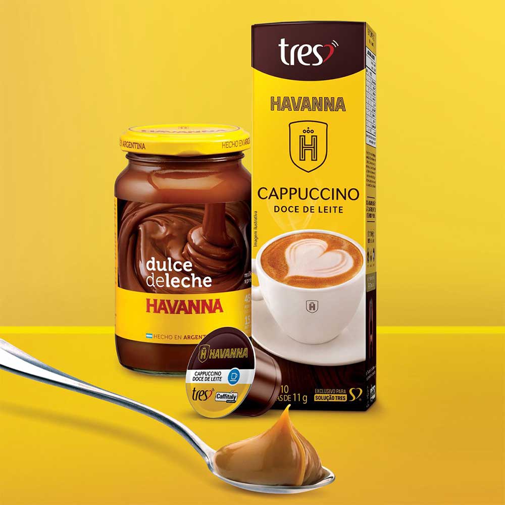 Uma deliciosa combinação de leite cremoso com o sabor singular do café bem tirado, em proporções adequadas é a fórmula básica da cápsula de cappuccino Doce de Leite Havanna TRES.