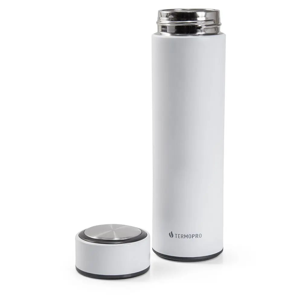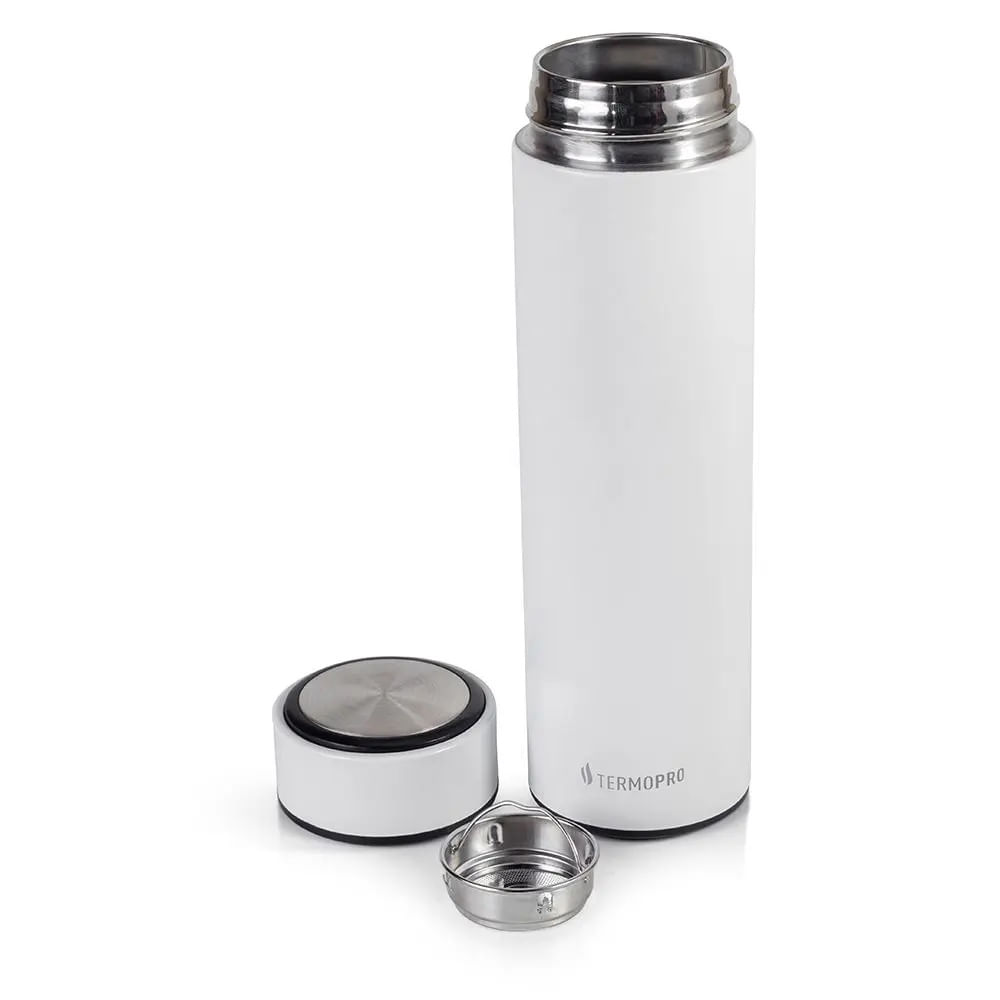 O Squeeze Térmico em Aço Inox da Termopro é fabricado em aço inoxidável e conserva bebidas quentes por até 12 horas e frias por até 24 horas. Possui sistema de rosca com vedação à prova de vazamentos e ampola térmica com dupla camada de aço inox 304, além de um filtro de aço para folhas de chá.