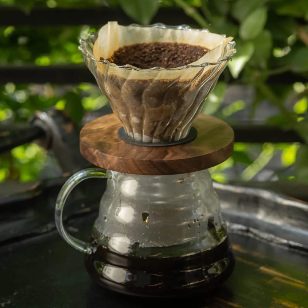 O suporte para filtro de café com base de madeira é feito em vidro borossilicato, material resistente a altas temperaturas, e possui base em bambu.