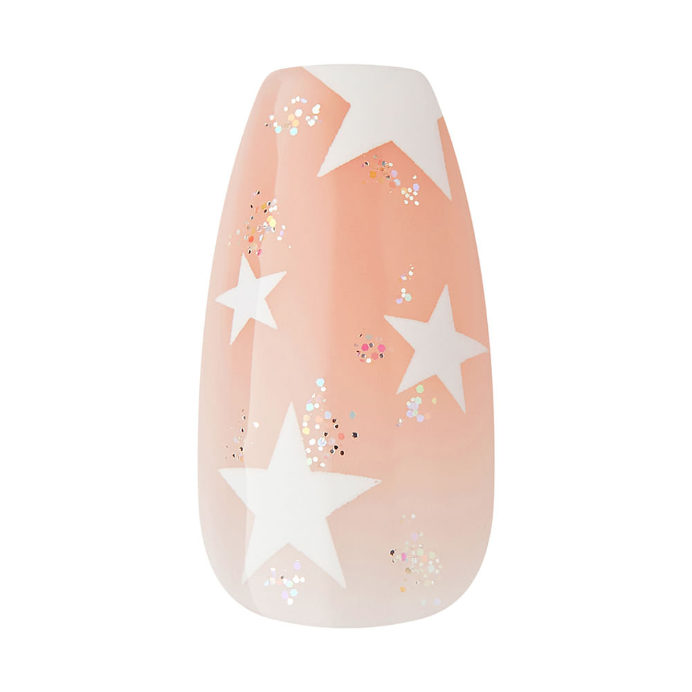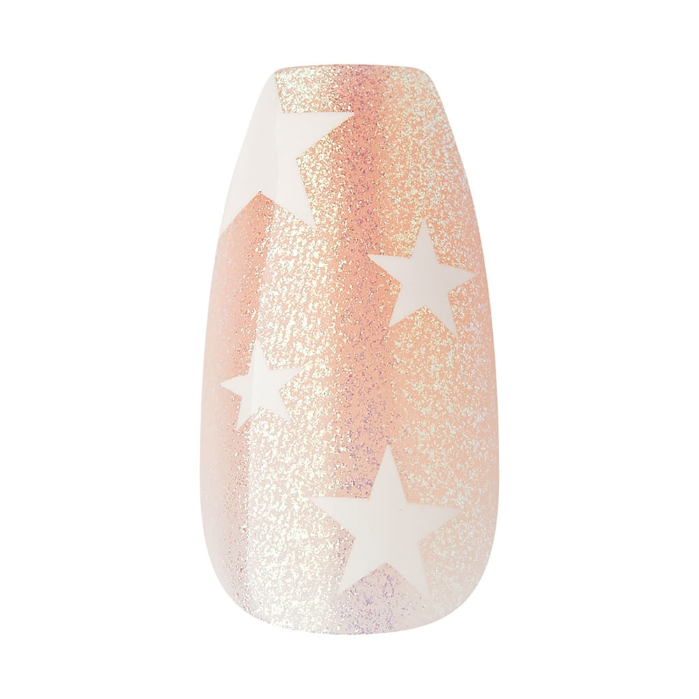 A unha esculpida Voguish Fantasy In The Stars da Kiss New York no formato bailarina a médio possue acabamento gel brilho e glitter tudo isso com encaixe perfeito.