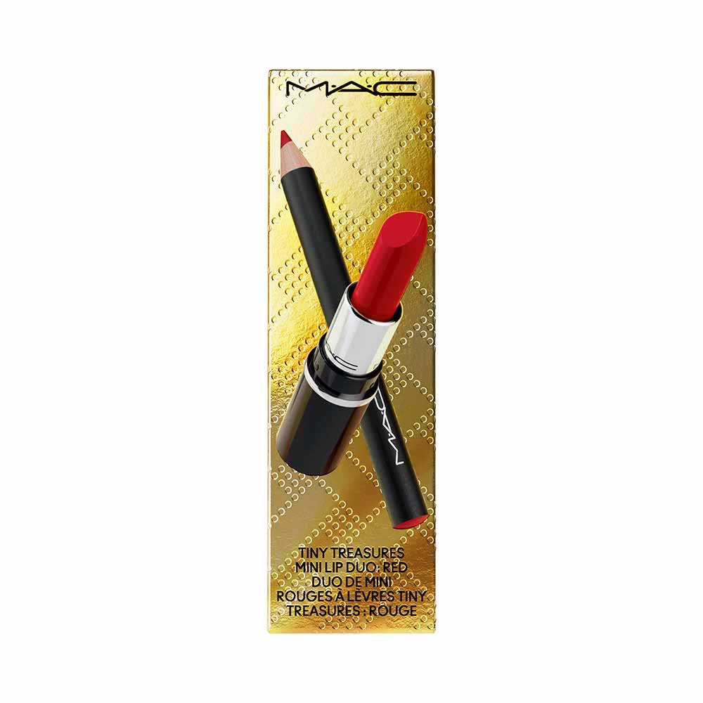 O MAC Kit Tiny Treasures é um conjunto que combina dois produtos essenciais para uma maquiagem labial impecável.