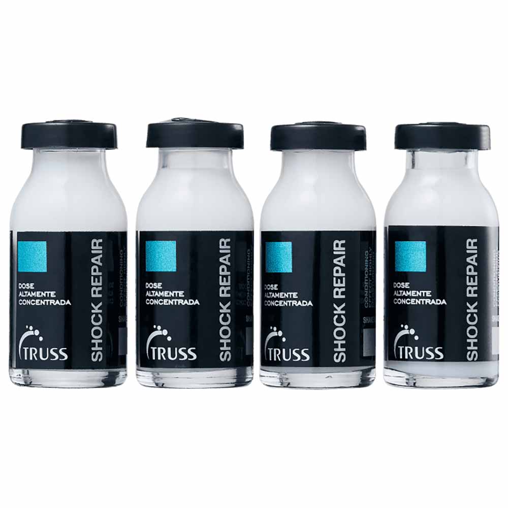 O kit Contém: 4 Truss Shock Repair Ampola - 17ml O que é e para que serve? A Truss Shock Repair Ampola é um tratamento capilar intensivo especialmente formulado para cabelos danificados e fragilizados, oferecendo uma solução eficaz para quem busca revitalizar os fios em casa. Com sua fórmula potente, essa ampola atua profundamente na fibra capilar graças à sua alta concentração de ativos reparadores. Ideal tanto para homens quanto mulheres que desejam recuperar a vitalidade dos seus cabelos sem precisar ir ao salão de beleza frequentemente. Quais os Benefícios do Kit? - Hidratação Profunda; - Reconstrução Imediata; - Força e Proteção; - Efeito Condicionante Avançado. Com o poder do Blend de Óleos naturais combinado com outros ativos concentrados, este produto promove uma nutrição intensa enquanto devolve movimento natural aos fios. Ativos: Arginina Plus: Conta com nutrientes indispensáveis para promover reparação e fortalecimento dos cabelos. Assegura vitalidade, brilho e volume na medida certa para cabelos que sofreram danos, além de proteger de agressões futuras. Óleo de Abacate: Conta com composição rica em nutrientes, vitaminas e ácidos graxos saudáveis. Confere hidratação e nutrição profundas, deixando os cabelos mais fortes e com brilho intenso. Previne o frizz e protege contra danos, além de estimular o crescimento e promover um tratamento eficaz para o couro cabeludo ressecado e com irritações. Além disso, é compatível com todos os tipos de cabelos. Nano Reparação: Garante uma camada de proteção que diminui o frizz, além de proteger a cor, promover brilho e conferir sedosidade para os fios. Proteína de Trigo Hidrolizada: Derivado do trigo, esse ativo promove proteção para restaurar a maleabilidade do fio, deixando-o mais natural e saudável. Pantenol: Retém a umidade, ajudando a deixar o fio mais espesso e forte, além de prevenir o surgimento de pontas duplas. Devolve a vitalidade após procedimentos de tintura e coloração. Queratina: Hidrata e dá força aos fios, reestruturando a fibra capilar, além de conferir condicionamento. Promove maior hidratação, além de ser capaz de regenerar e reparar o fio. Creatina: Revitaliza fios danificados penetrando profundamente na fibra capilar, o que torna o fio mais forte e hidratado. Confere proteção e desembaraçamento fácil. Repara o fio danificado e combate o envelhecimento precoce. Soft Hair/Soft Amid: Garante cabelos mais fortes, livres de frizz, macios e brilhantes, com maior facilidade de desembaraçamento. Nano Restauração: Confere condicionamento ao mesmo tempo em que forma uma película protetora para o fio, tratando-os por dentro e por fora. Assegura cabelos brilhantes e seca rapidamente em contato com ferramentas de calor. Bio-Cisteína/Ativos Multifuncionais: Capaz de penetrar profundamente no fio reparando sua cutícula para formar uma camada de proteção contra danos externos. Confere fios resistentes e flexíveis, sendo ideal para cabelos com química. Assegura hidratação e facilidade no desembaraçamento, deixando o cabelo macio e brilhante. Modo de Uso: 1. Aplique por todo o cabelo, massageando suavemente. 2. Espere 3 minutos e enxágue. Para melhores resultados e fios saudáveis, adicione o tratamento TRUSS SHOCK REPAIR na sua rotina de cronograma capilar, seu uso é indicado 1 vez por semana. Precauções: Evite contato com os olhos. Não aplique no couro cabeludo irritado ou lesionado. Descontinue o uso em caso de sensibilização. Mantenha fora do alcance de crianças.