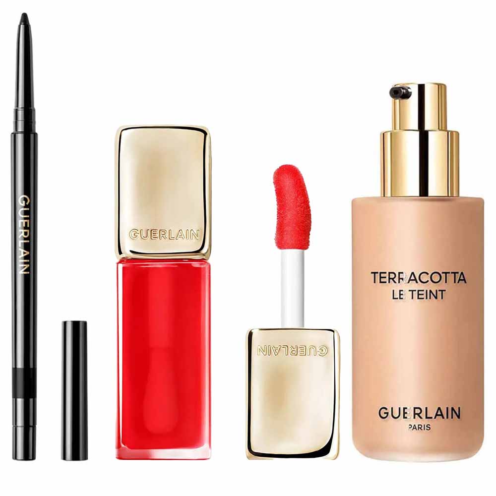 Descubra a combinação perfeita de maquiagem e cuidado com a Base Líquida Guerlain Terracotta Le Teint, o Lip Oil Guerlain Kiss Kiss Bee Glow e o Lápis de Olhos Intenso Guerlain.