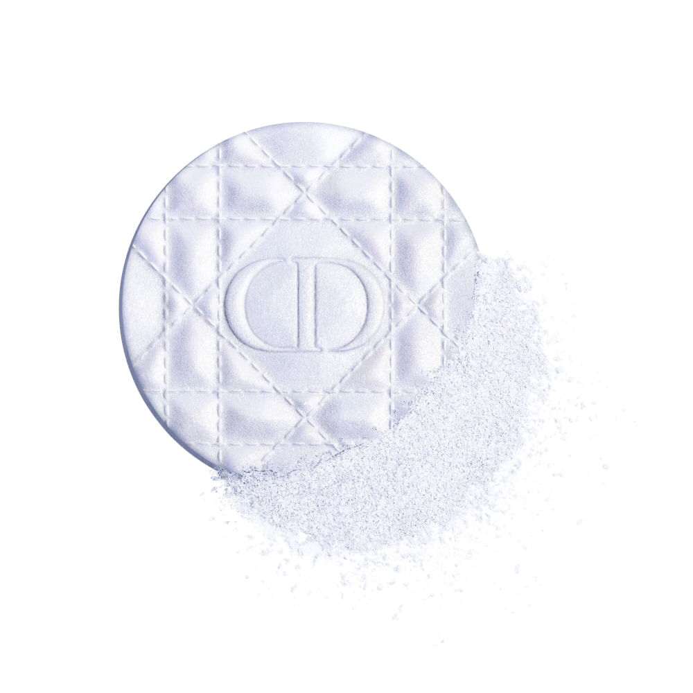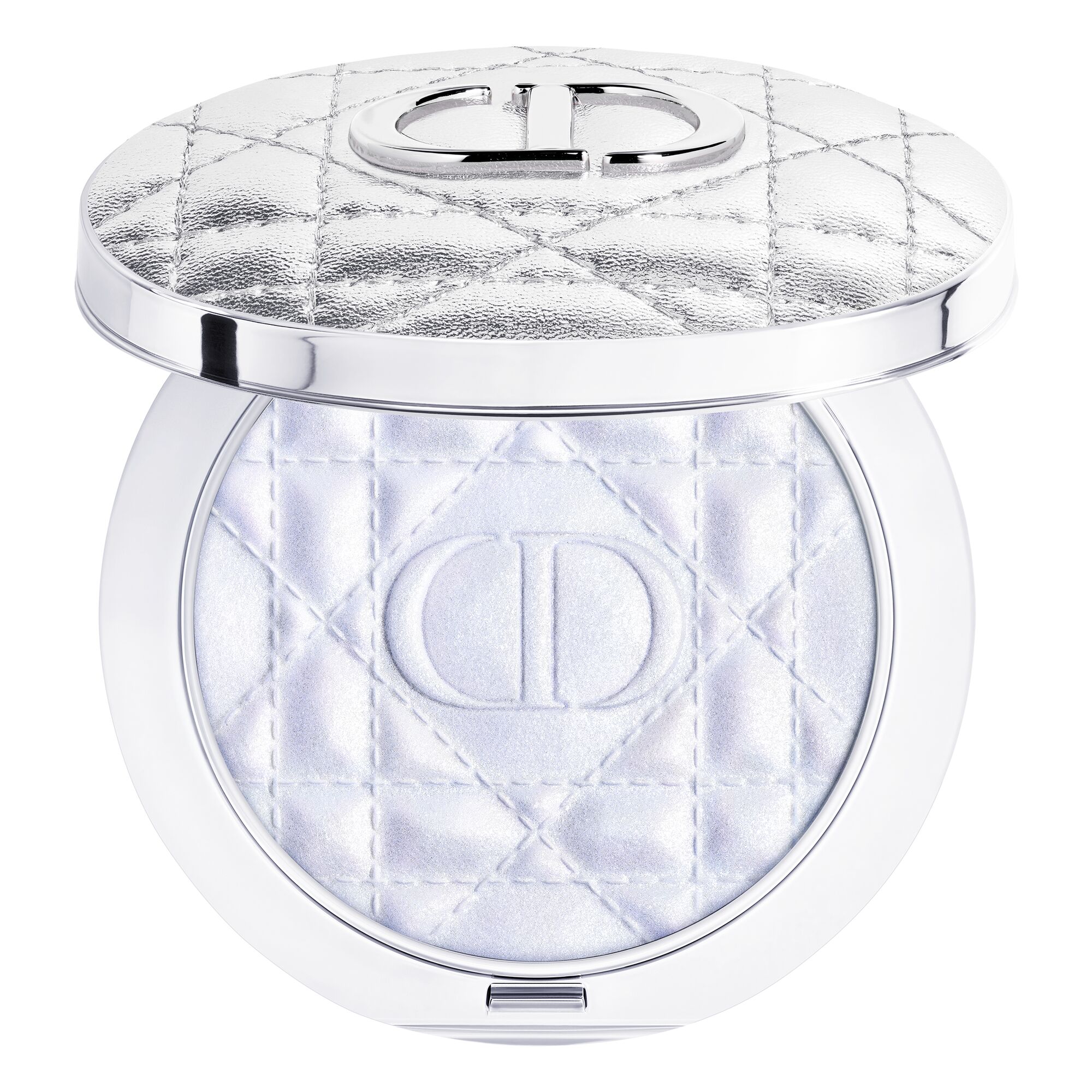 Pó iluminador encaixado em um estojo couture prateado com as iniciais CD de Christian Dior.