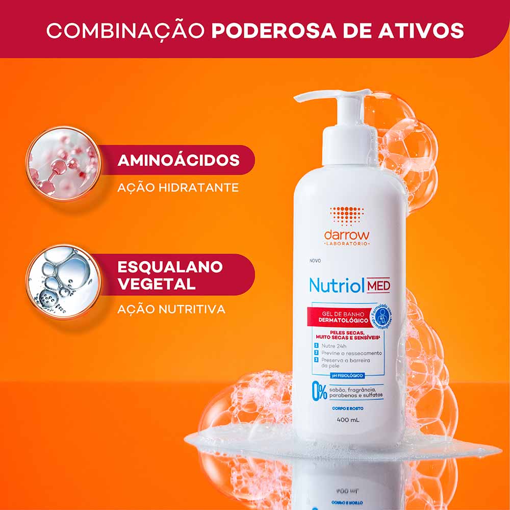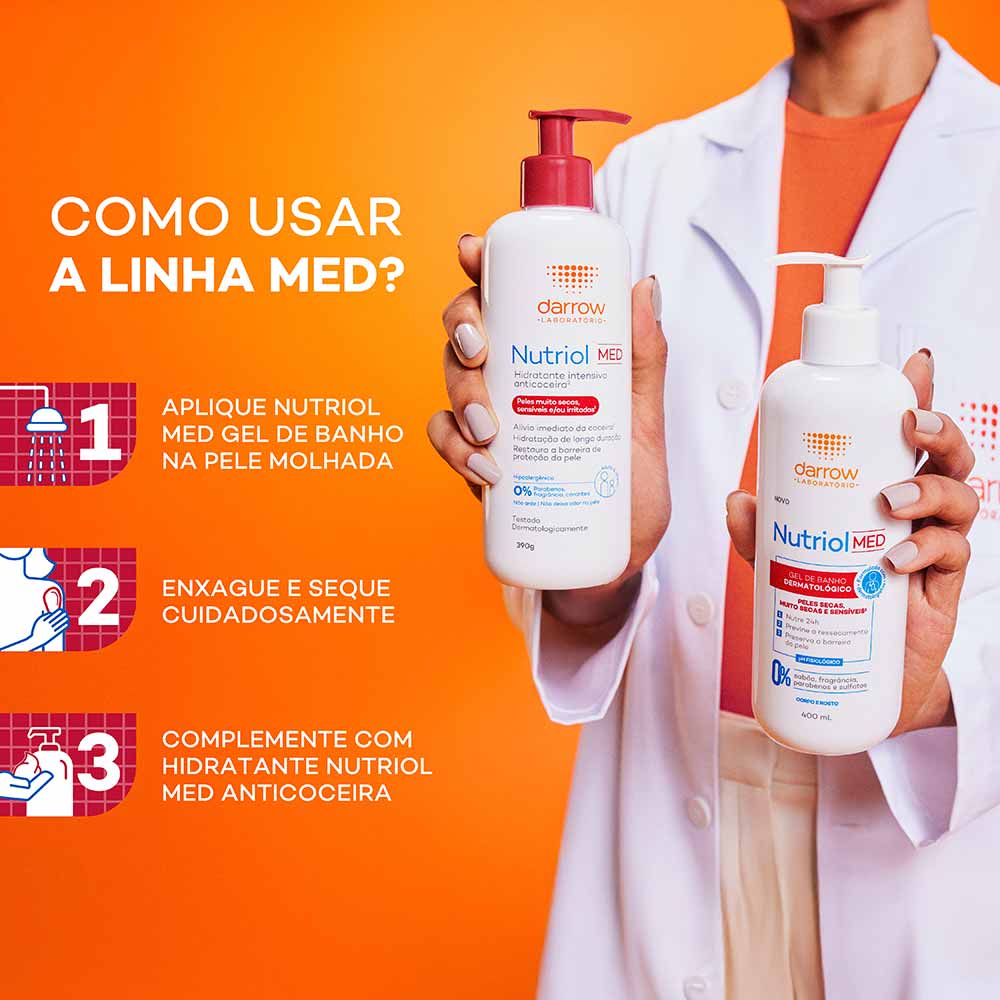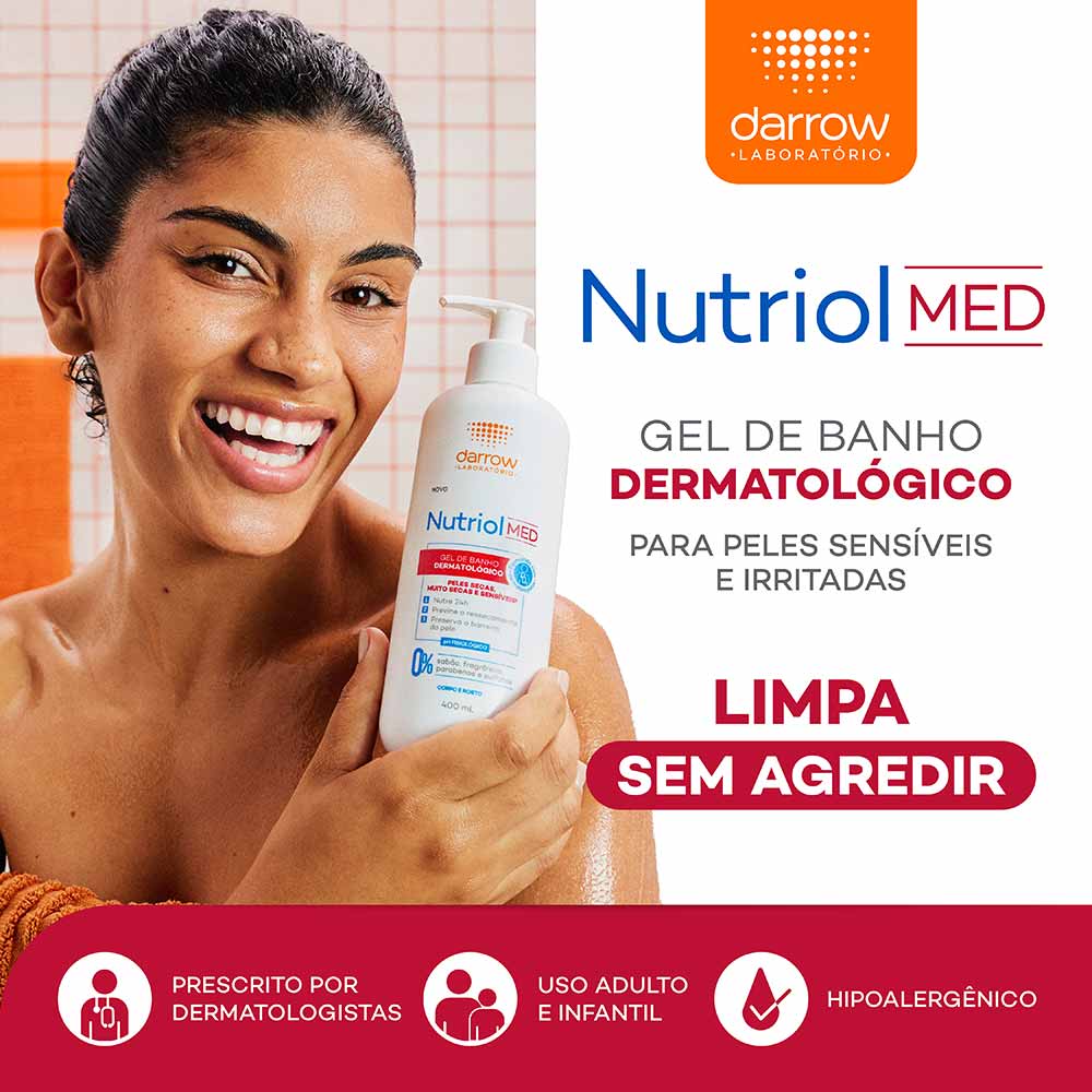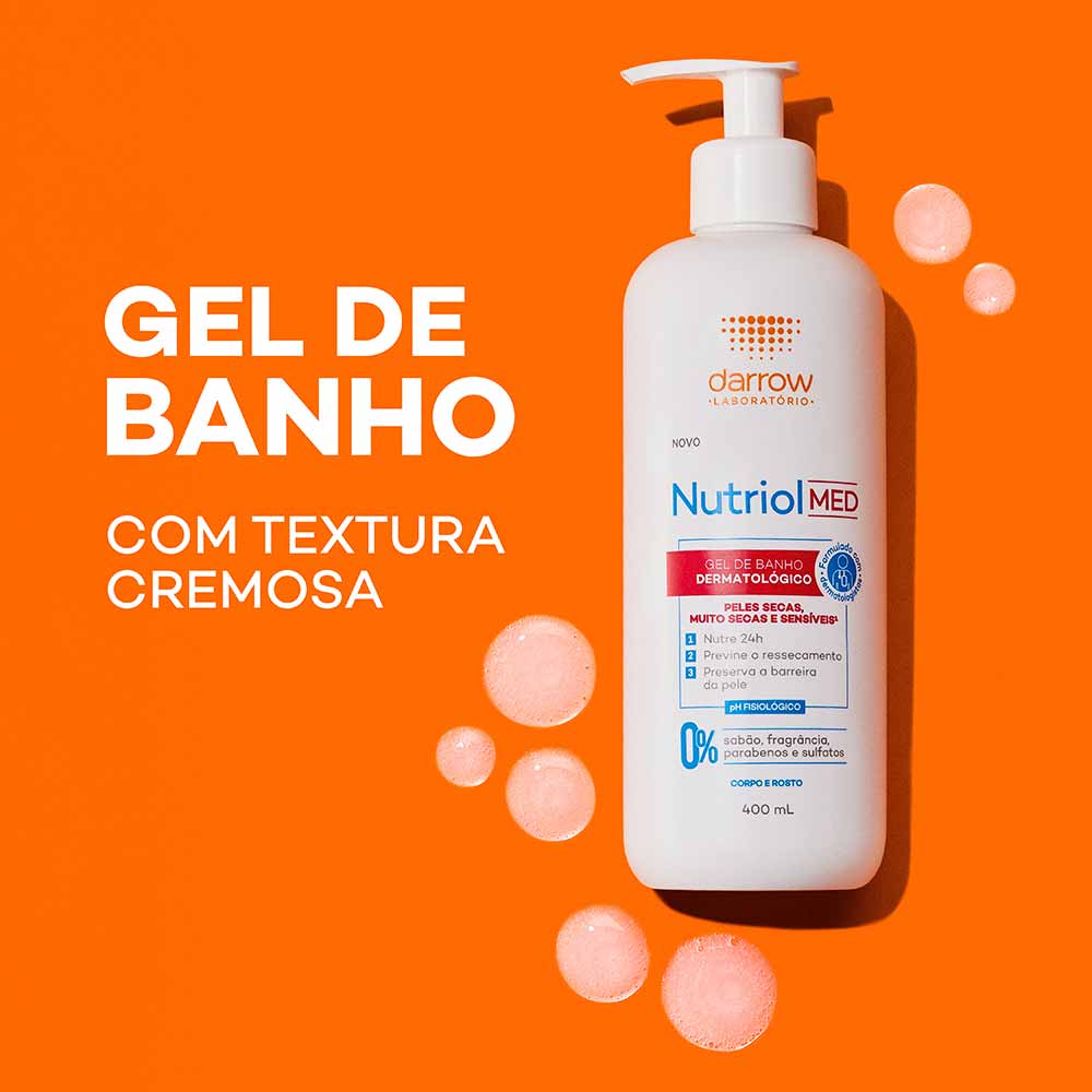 O Nutriol Med é um Gel de Banho Dermatológico com espuma cremosa. Desenvolvido com dermatologistas para a higiene de peles secas, muito secas e sensíveis, oferecendo uma limpeza eficaz sem agredir a pele, ajudando a restaurar e fortalecer a barreira cutânea prolongando a hidratação após o banho.