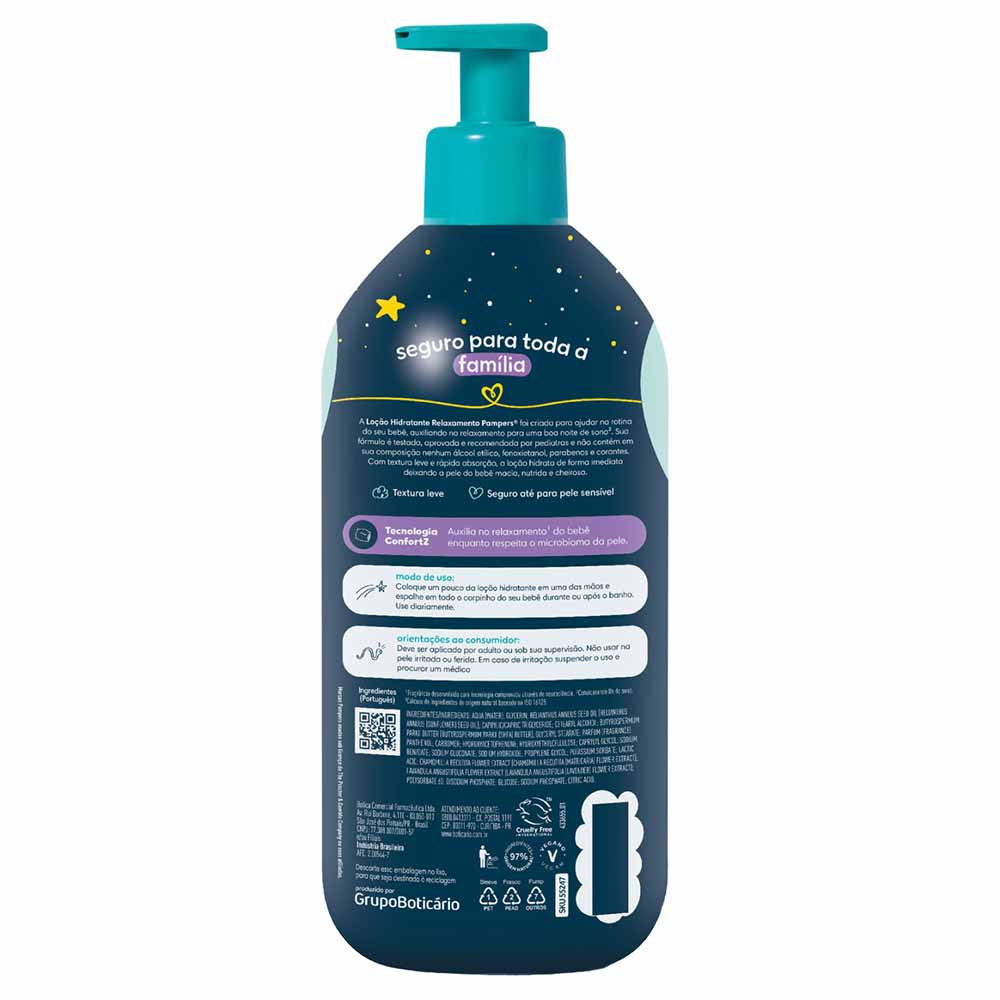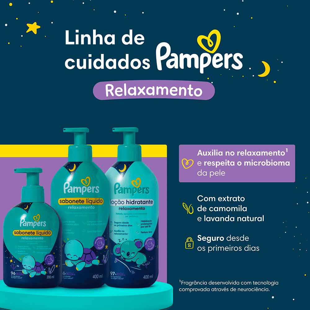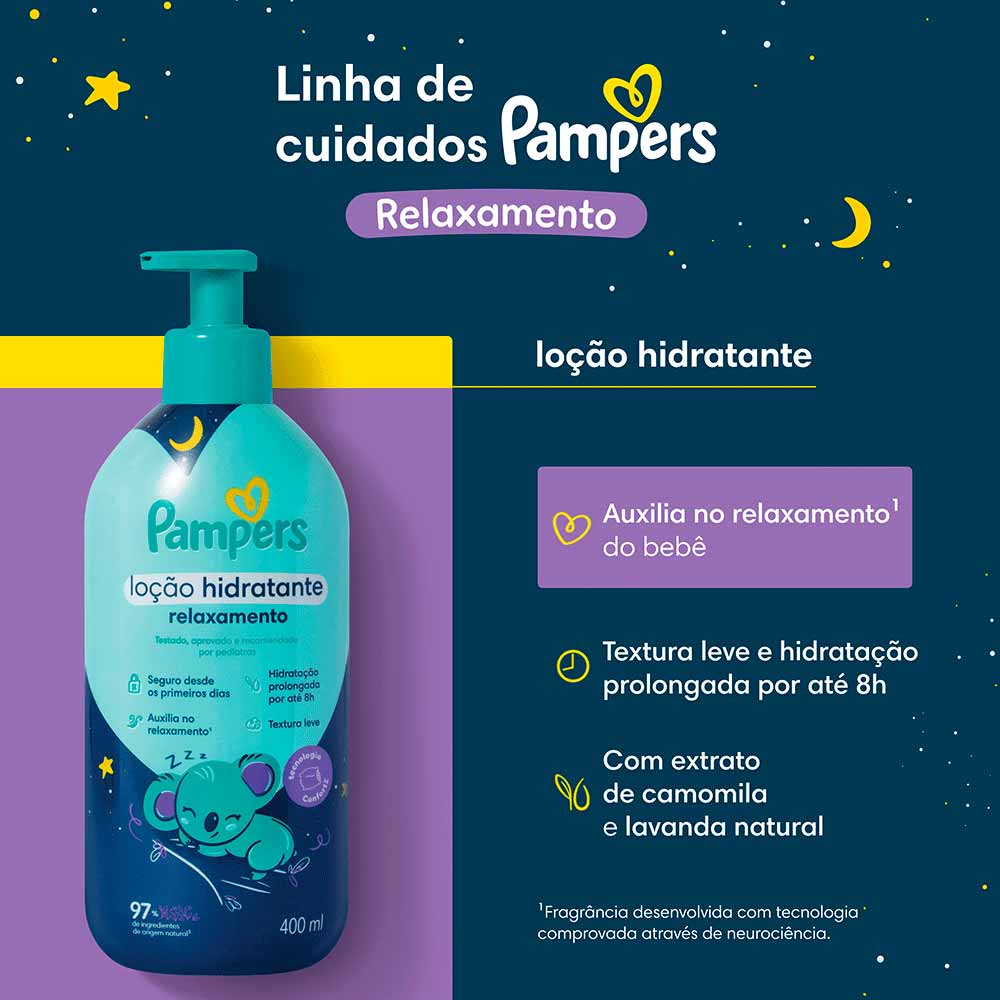 A Loção Hidratante Relaxamento Pampers foi desenvolvida para acalmar e hidratar a pele do bebê, ajudando a criar um ambiente relaxante que favorece uma noite de sono mais tranquila. Com a ação combinada dos extratos de camomila e lavanda, a loção proporciona um efeito calmante, ideal para ser utilizada após o banho ou sempre que for necessário acalmar o seu bebê.