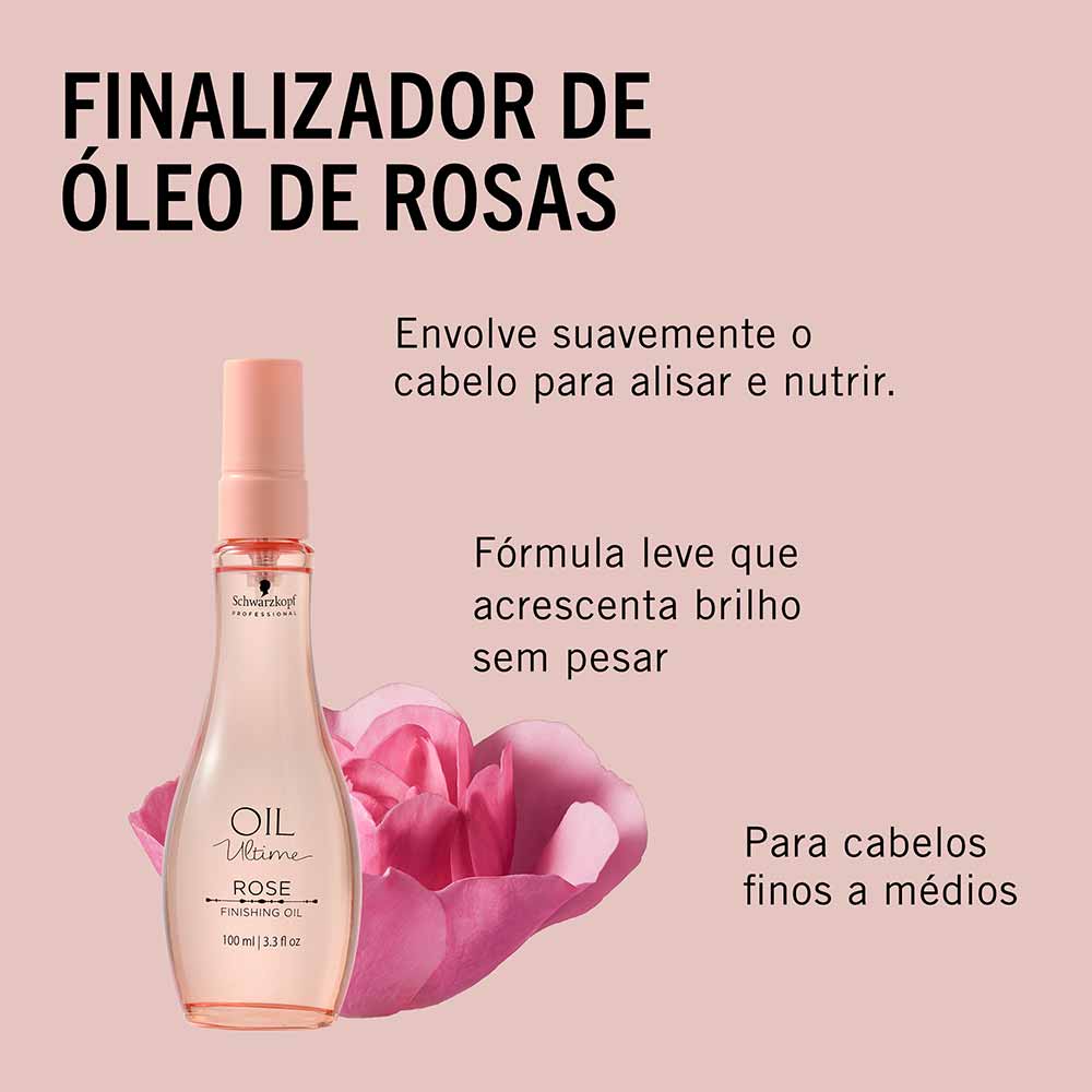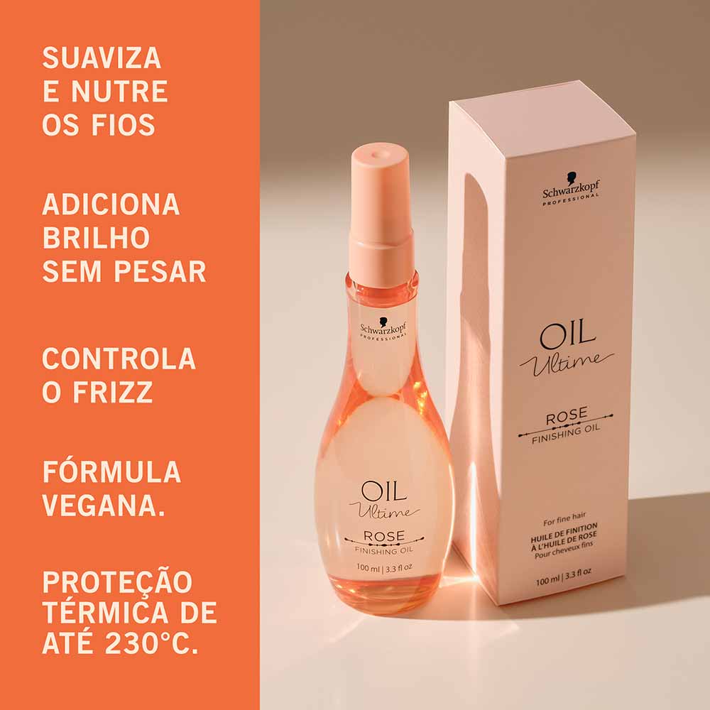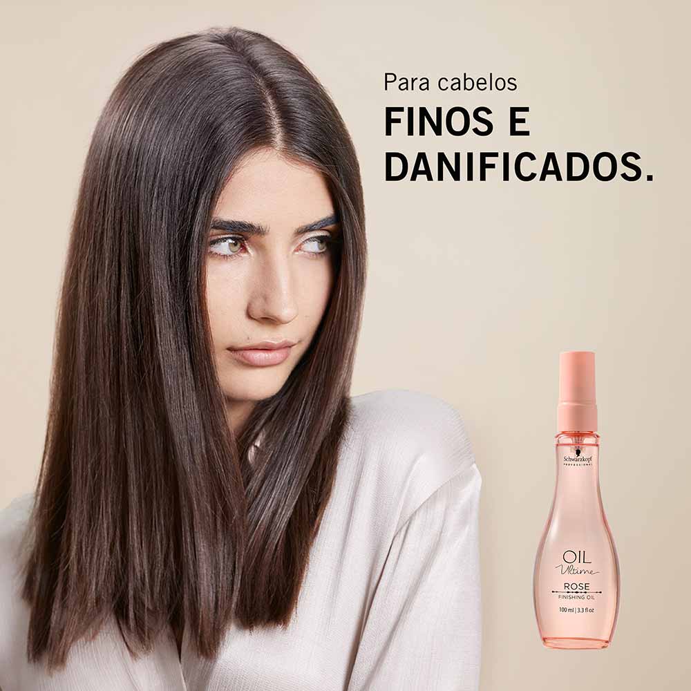 1- Aplique uma pequena quantidade do Óleo Rosas Schwarzkopf Professional Oil Ultime nas palmas das mãos e distribua uniformemente nos cabelos úmidos ou secos, concentrando-se nas pontas. Não enxágue. Modele como desejar.