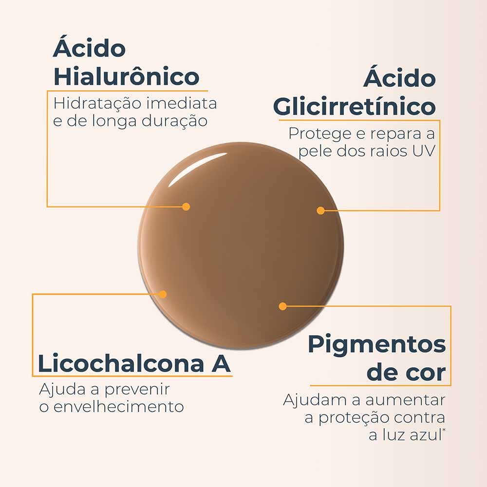 Sua fórmula contém pigmentos de cores que ajudam a aumentar a defesa contra os raios UV e luz azul, além de prevenir o envelhecimento precoce.