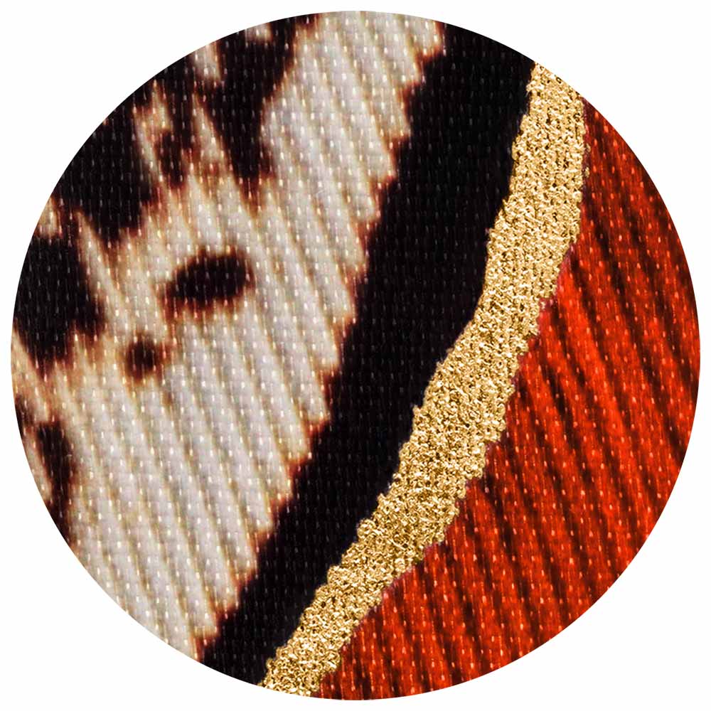 Phoenix: inspirada nas penas da fênix, o contraste marcante entre o vermelho vibrante e um bege delicadamente salpicado, realçado por um toque de dourado.