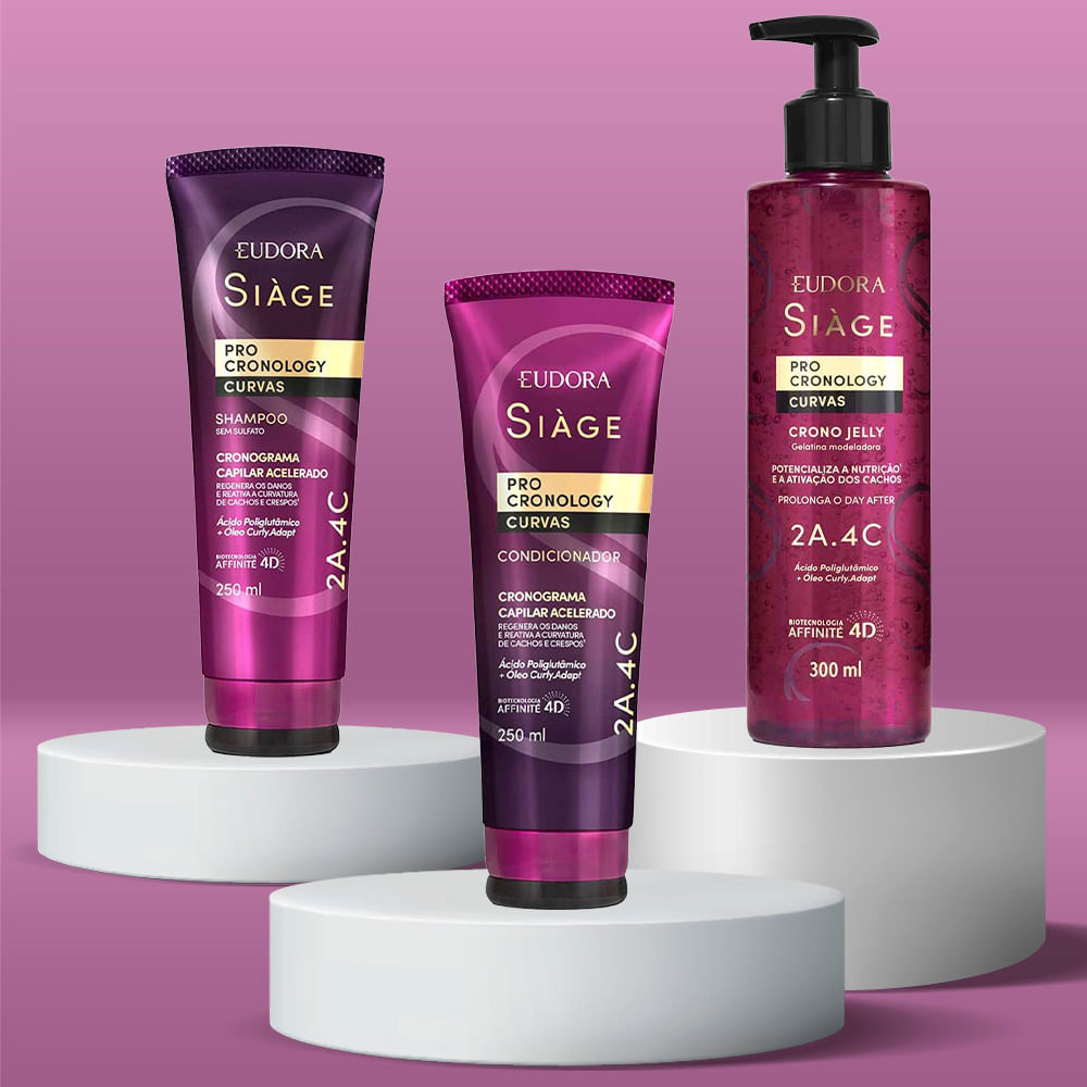 O Kit Eudora Siàge Pro Cronology Curvas é a solução ideal para quem deseja cuidar dos cabelos cacheados e crespos com excelência. Composto por shampoo, condicionador e finalizador, este kit visa atender às necessidades específicas das curvaturas 2A a 4C, oferecendo hidratação profunda, definição prolongada e regeneração dos fios. A linha é enriquecida com Ácido Poliglutâmico e Óleo Curly.Adapt, que proporcionam maciez e aderência perfeita à fibra capilar, garantindo cachos revitalizados e cheios de vida.