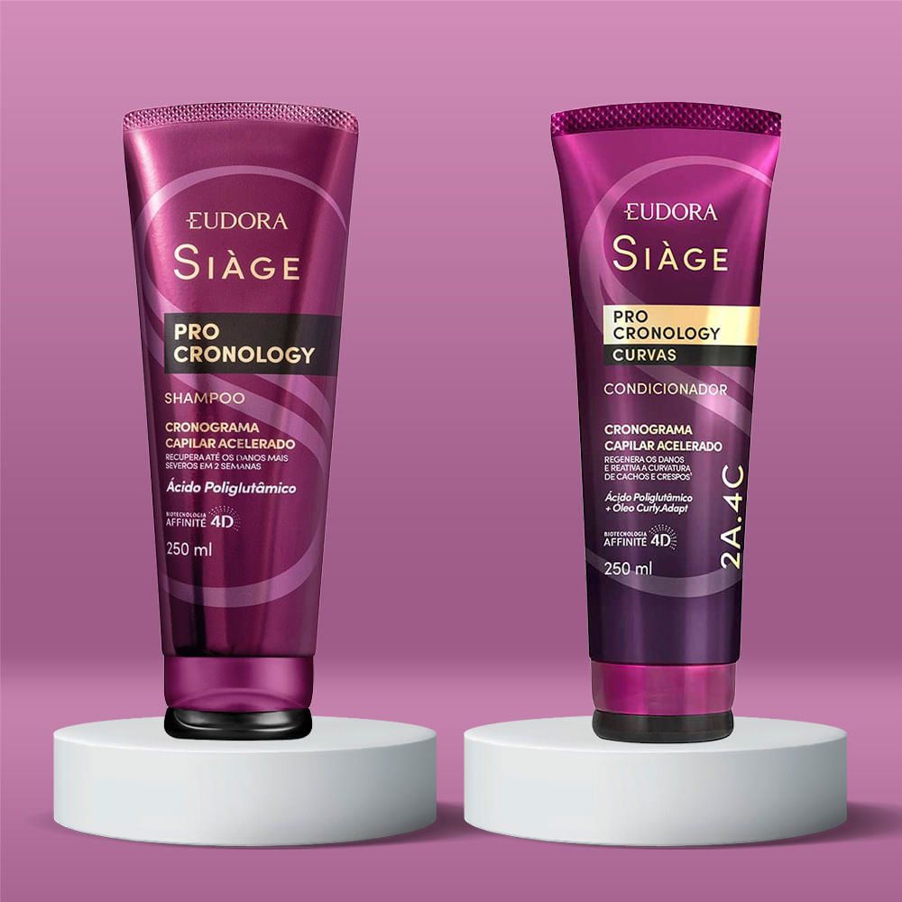 O Eudora Siàge Pro Cronology Kit é enriquecido com Ácido Poliglutâmico, um ativo biotecnológico obtido por fermentação natural. Este ingrediente é um dos mais potentes e eficazes hidratantes, atuando no equilíbrio da umidade natural interna e externa dos fios.