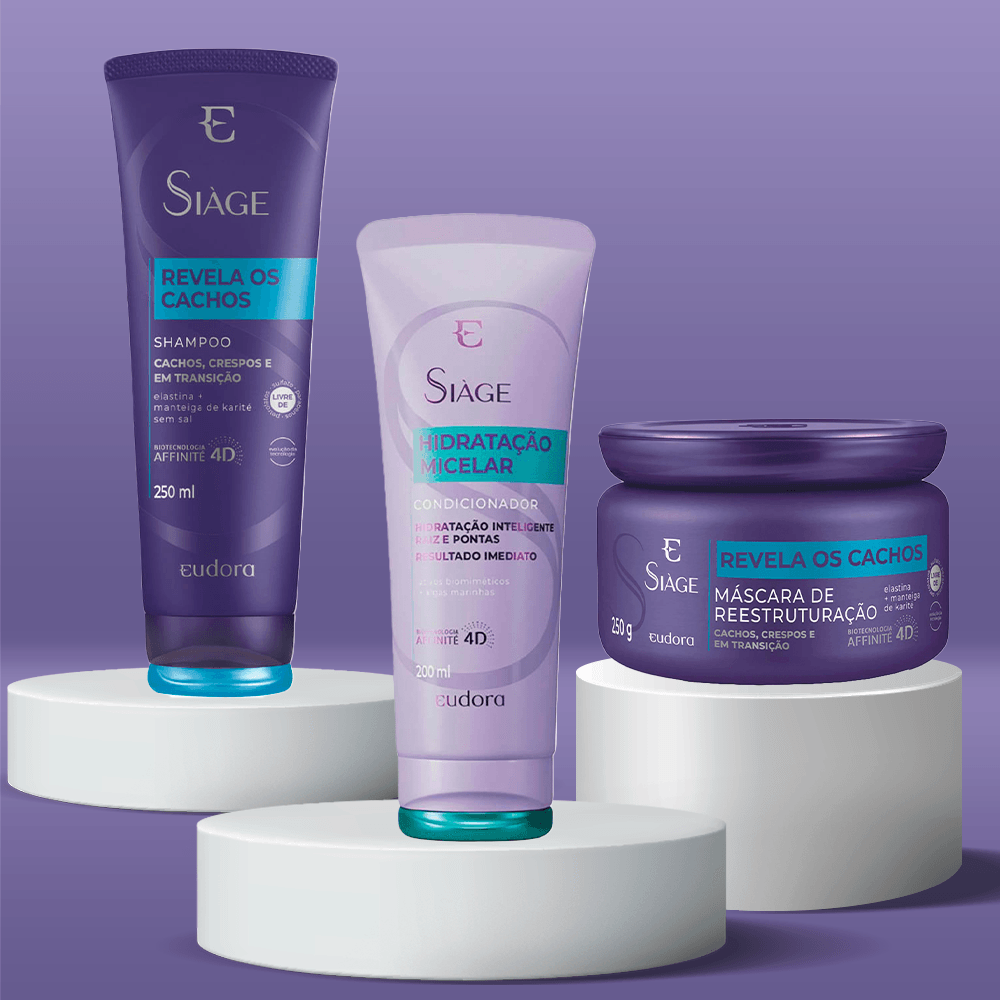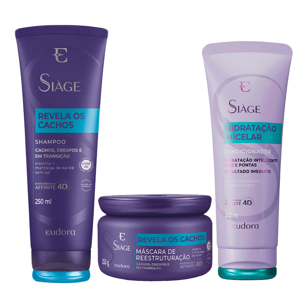 O Eudora Siàge Hidratação Micelar Kit é composto por shampoo, condicionador e máscara que promovem uma hidratação profunda e duradoura desde o primeiro uso. Desenvolvido com uma estrutura inteligente, o kit é enriquecido com Ativos Biomiméticos e Algas Marinhas, proporcionando uma recuperação visível da saúde dos fios enquanto protege contra as agressões diárias. Este kit é ideal para quem busca cabelos super hidratados, soltos e brilhantes, sem sobrecarregar os fios.