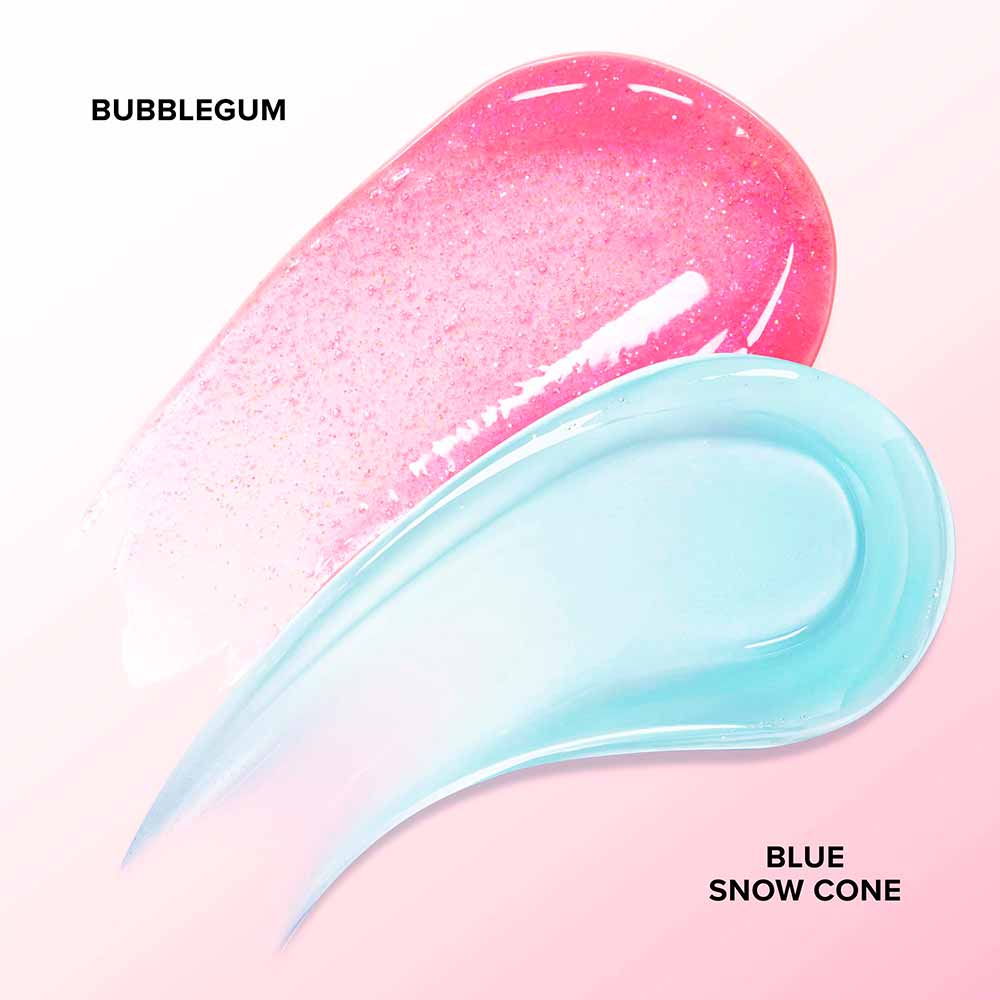 Inclui a cor exclusiva Blue Snow Cone (Azul gelado brilhante) e a cor Bubblegum (Rosa com brilho dourado) do nosso óleo/gloss labial híbrido ultra-nutritivo que suaviza instantaneamente os lábios, deixando-os totalmente irresistíveis.