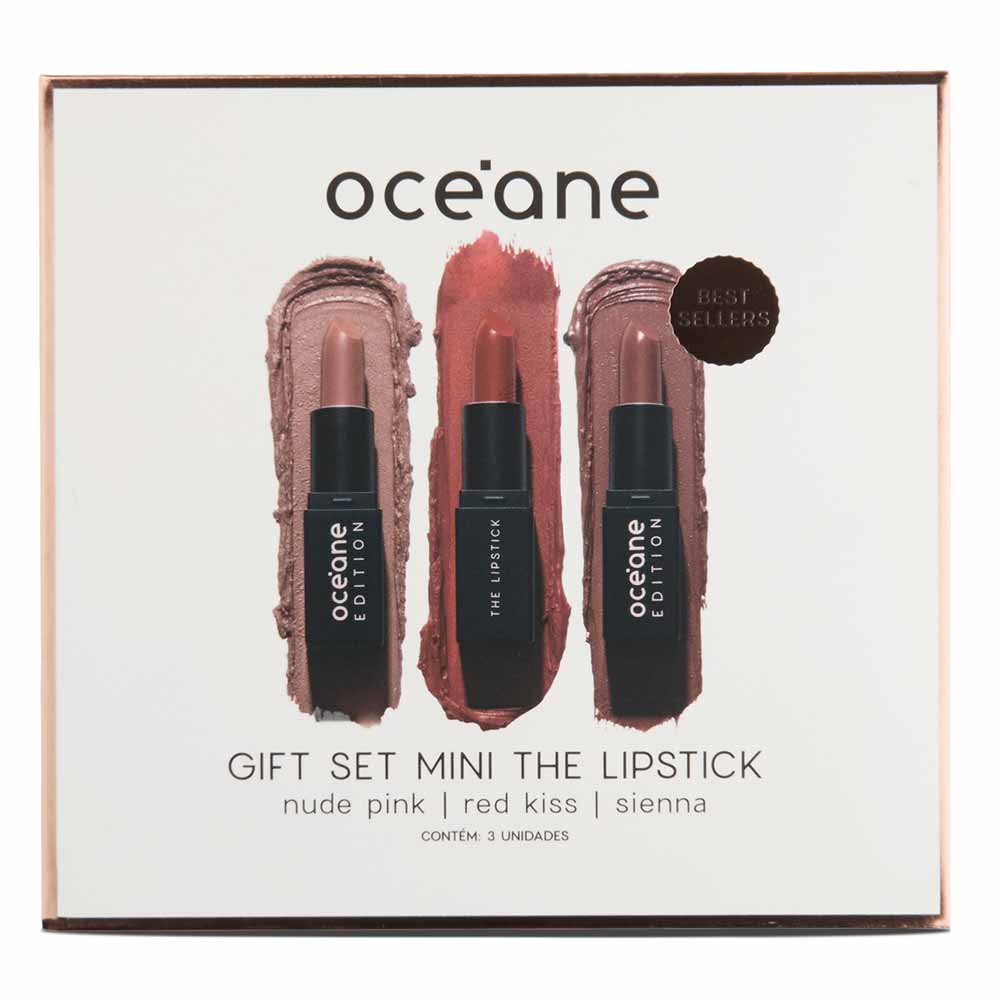 Océane Edition The Lipstick Kit - Mini Batom Sienna + Mini Batom Nude Pink + Mini Batom Red Kiss é um trio de batons em miniatura perfeito para quem ama maquiagem prática, versátil e elegante.