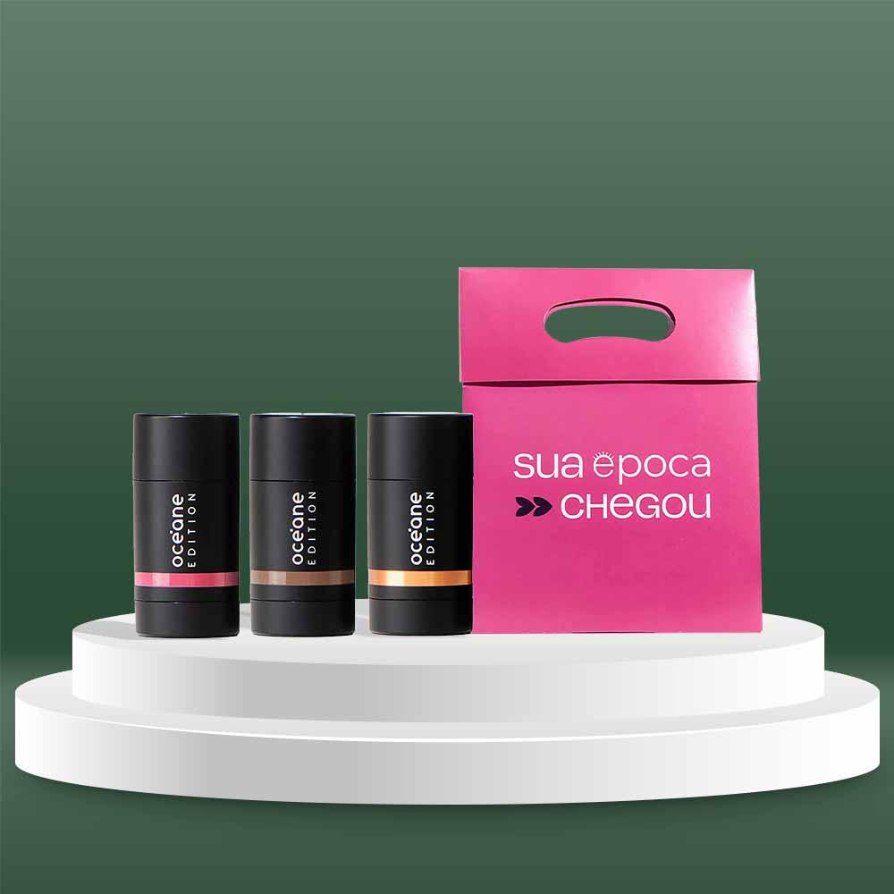 O Kit de Natal Océane Minis é a escolha perfeita para quem ama maquiagem e deseja praticidade e resultados incríveis. Este kit inclui três produtos essenciais em versão mini: Blush, Contorno e Iluminador, todos em bastão, além de uma elegante sacola presenteável da Época Cosméticos. Cada item foi projetado para facilitar sua rotina de beleza, proporcionando uma maquiagem impecável a qualquer momento e em qualquer lugar.