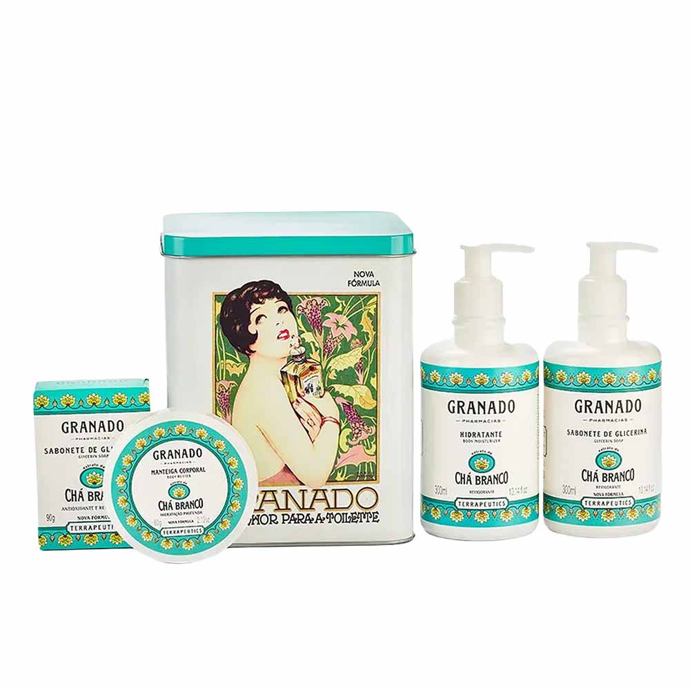 Kit Granado Terrapeutics Cha Branco Sabonete em Barra + Sabonete Líquido + Hidratanete Corporal +Manteiga Corporal +Lata Decorativa