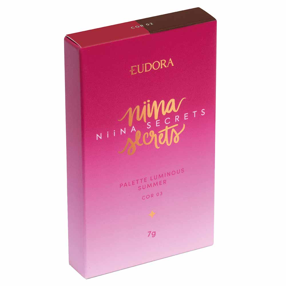 A Paleta Niina Secrets Luminous Summer Cor 3 traz a cor Marrom Chocolate Escuro em textura cremosa semi-matte, ideal para um contorno profundo e ultra definido. O blush é um tom Framboesa Vibrante para um efeito de alto impacto.