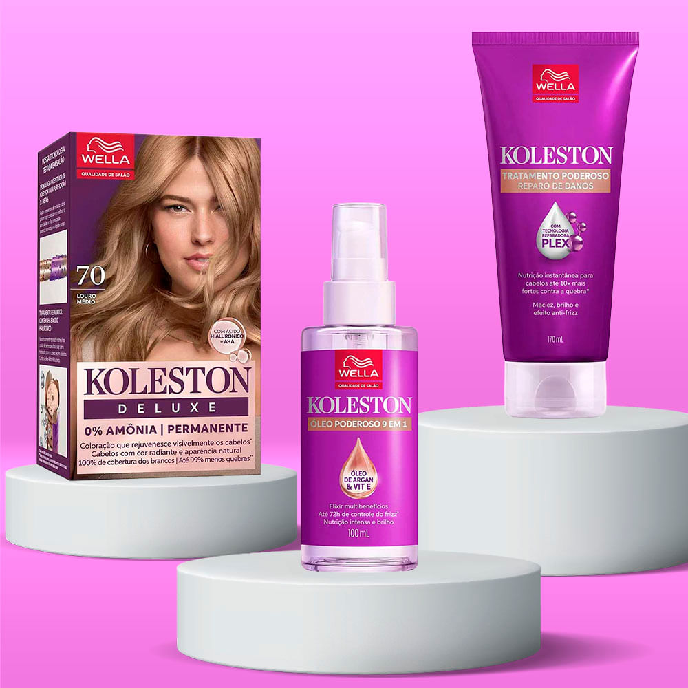 O Koleston Poderoso Kit – Coloração Deluxe Louro Medio 7.0 + Tratamento + Óleo Capilar é um kit completo para quem busca transformar os cabelos em casa com praticidade, alta performance e um cuidado profundo. O kit oferece coloração permanente sem amônia, tratamento reparador de danos e um óleo capilar multifuncional, garantindo cabelos intensamente coloridos, protegidos e saudáveis desde a primeira aplicação. Ideal para quem deseja cor vibrante, cobertura total dos fios brancos e uma rotina de beleza prática e eficiente.