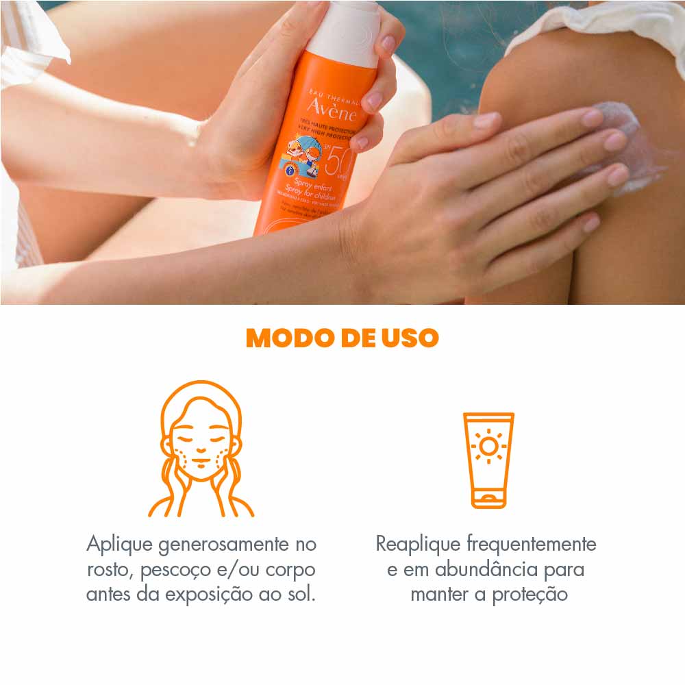 1. Aplique o spray abundantemente e maneira uniforme no rosto e corpo antes da exposição solar.