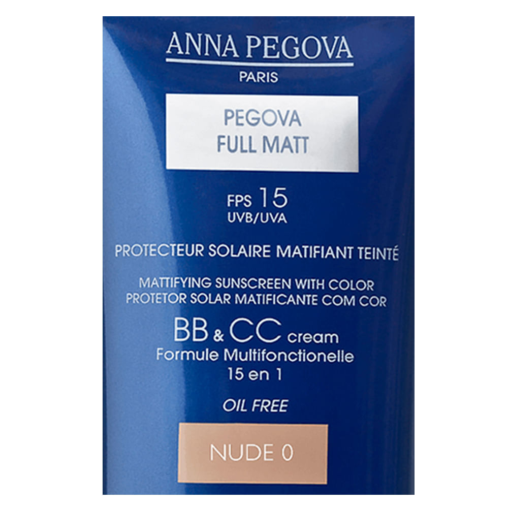 Fórmula Multifuncional 15 em 1. O Full Matt BB & CC Cream possui FPS 15 protegendo a pele dos raios UVB/UVA. Oil Free. BB de Blemish Blam e CC de Color Control. Indicado: Para todos os tipos de peles, inclusive as oleosas e com tendência a acne. Benefícios: 1- Protege dos UVA e UVB 2- Previne do envelhecimento precoce graças à proteção solar 3- Reduz e controla a oleosidade por 8 horas 4- Matificante de longa duração 5- Hidrata sem pesar 6- Fornece uma boa cobertura sem perder a naturalidade 7- Efeito Antirrugas óptico graças aos pigmentos refletores de luzes 8- Ajuda a disfarçar poros abertos 9- Cobre cicatrizes e imperfeições 10- Uniformiza e ilumina a pele 11- Age como primer 12- Toque seco e aveludado 13- Excelente fixação 14- Reduz a aparência da pele avermelhada 15- Oil free e anticomedogênico Modo de Usar:A Marca: Desde sua origem em Paris / França, há 70 anos, dos quais 42 no Brasil, Anna Pegova tem sido uma marca de vanguarda com o compromisso de surpreender os seus clientes com o lançamento de cosméticos, com a utilização de tecnologias de ponta e de ativos de primeira qualidade em concentrações que garantem resultados notáveis. Graças a essa visão e aos seus compromissos, Anna Pegova hoje é uma marca que conquistou de forma muito clara sua identidade junto aos seus clientes - a maior prova disso, são os resultados obtidos na pele, confirmados pelos relatos e pela fidelidade à marca que passa de geração a geração, e ao mercado estético, tornando-se inclusive referência para tantas outras.