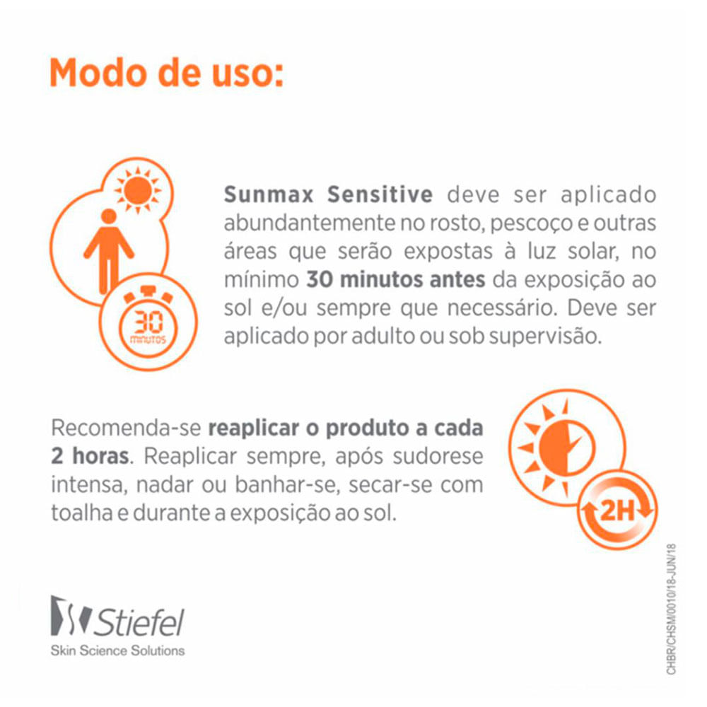 Sensitive FPS50 de Sunmax possui textura leve e finalização matte. É hipolergênico, sem álcool, parabenos ou corante. Não irrita a pele, é livre de álcool, parabeno, corante e fragrância, e é ideal para a pele oleosa e sensível por tratamento. Pode ser usado por crianças a partir de 6 meses. Dermatologicamente testado. Indicação: Para peles sensíveis e oleosas. Benefícios: • Loção oil free com exclusiva textura matte. • Não irrita nem deixa brilho na pele e é ideal para a pele oleosa e sensível por tratamento. • Livre de álcool, parabenos, corante e fragrância. • Dermatologicamente testado. • Ajuda a prevenir queimaduras solares, vermelhidão e fotoenvelhecimento prematuro da pele Modo de Usar: Sensitive FPS 50 deve ser aplicado abundantemente no rosto, pescoço e outras áreas que serão expostas à luz solar, no mínimo 30 minutos antes da exposição ao sol e sempre que necessário. Recomenda-se reaplicar o produto a cada 2 horas. Reaplicar sempre, após sudorese intensa, nadar ou banhar-se, secar-se com toalha e durante a exposição ao sol. Se a quantidade aplicada não for adequada, o nível de proteção será significativamente reduzido.