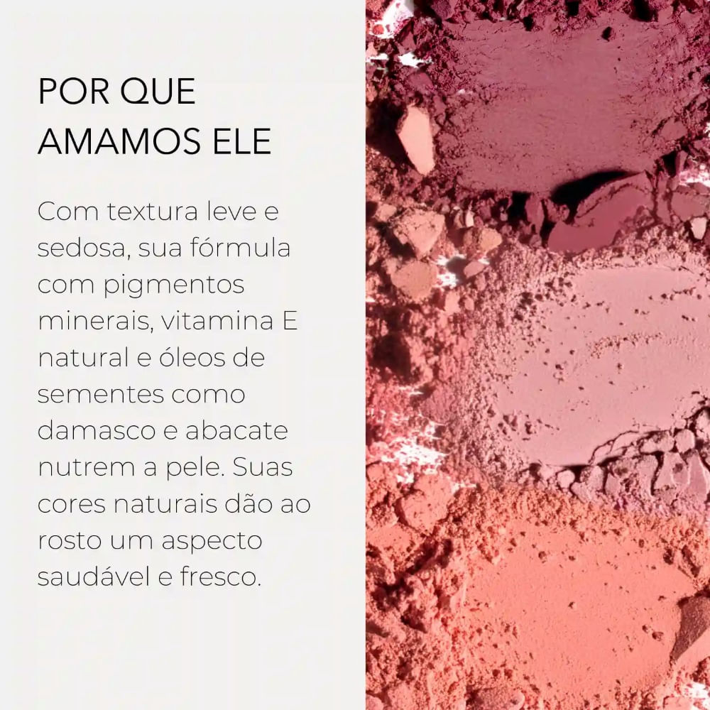 - Um Blush com textura em pó muito leve e sedosa que se funde na pele;