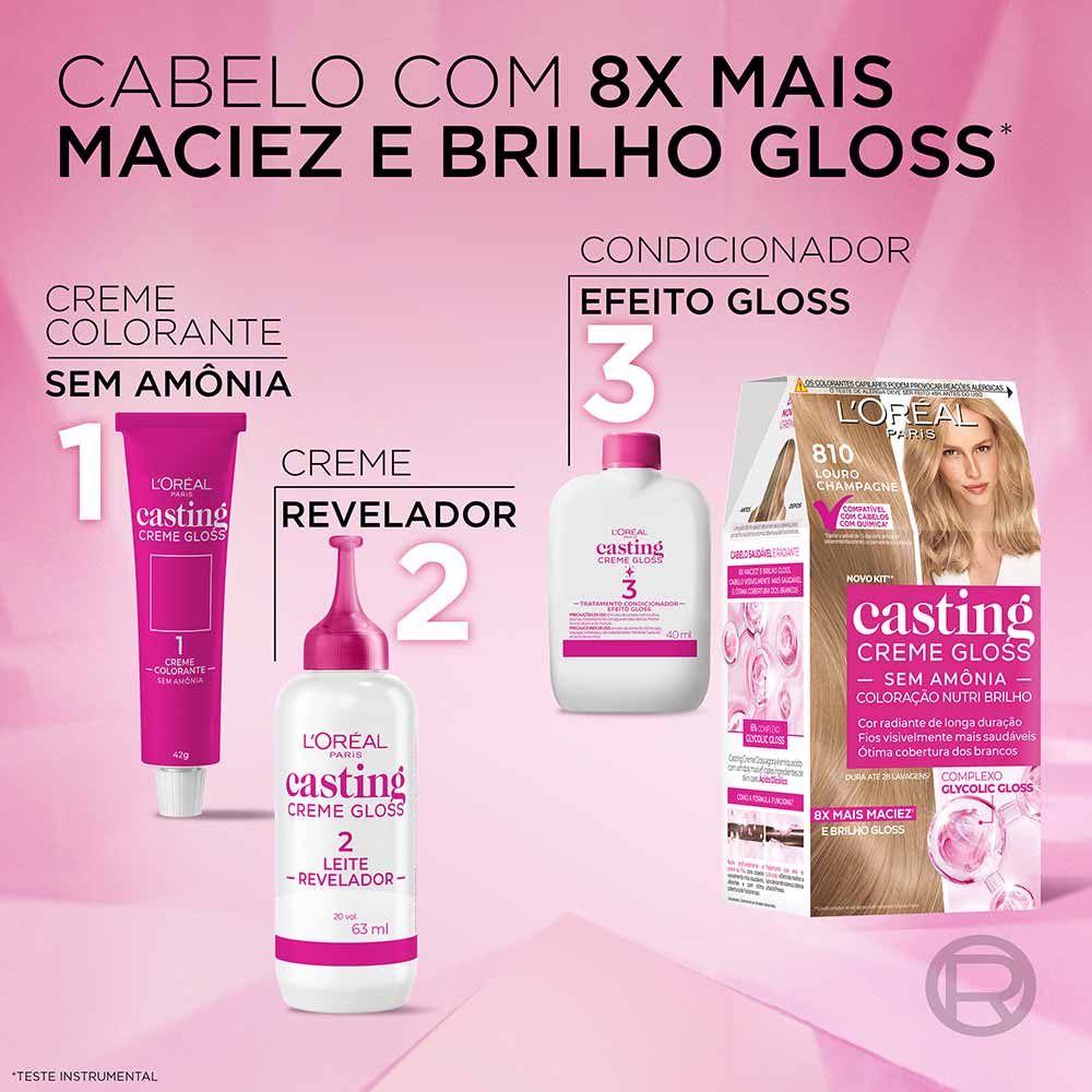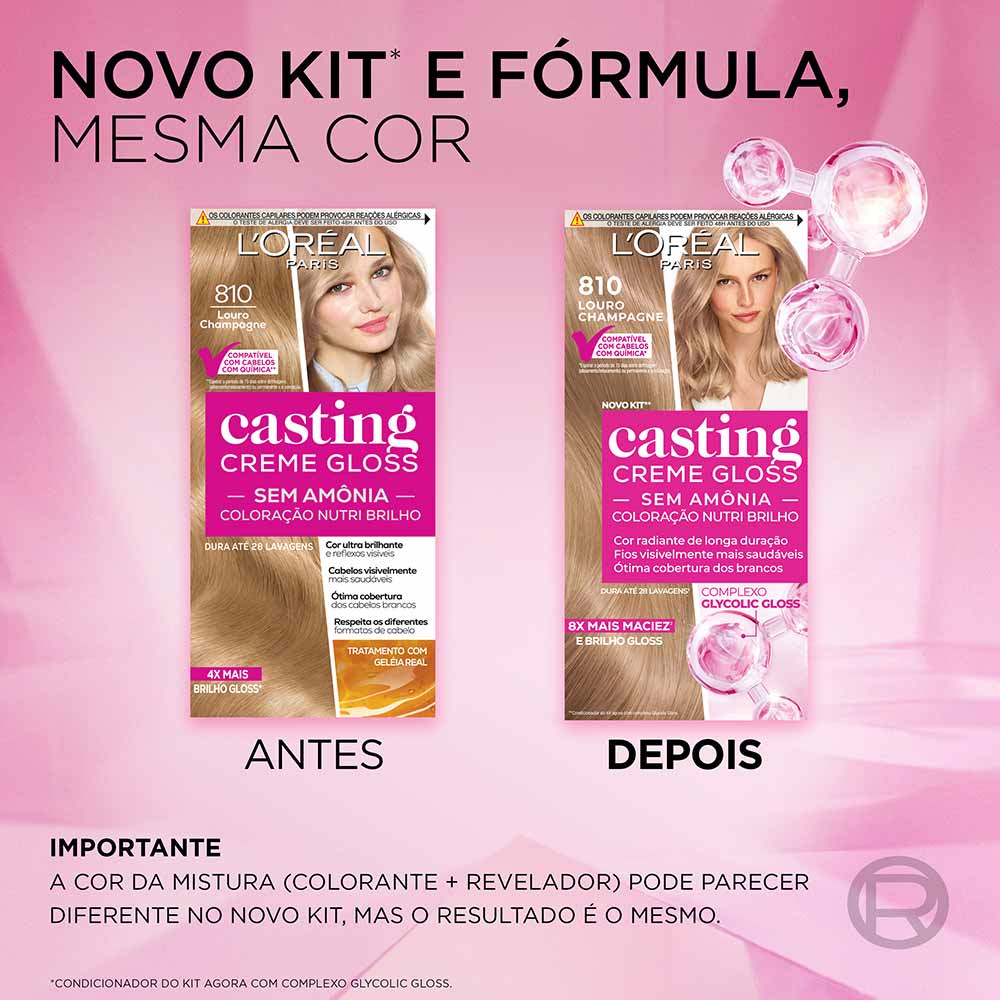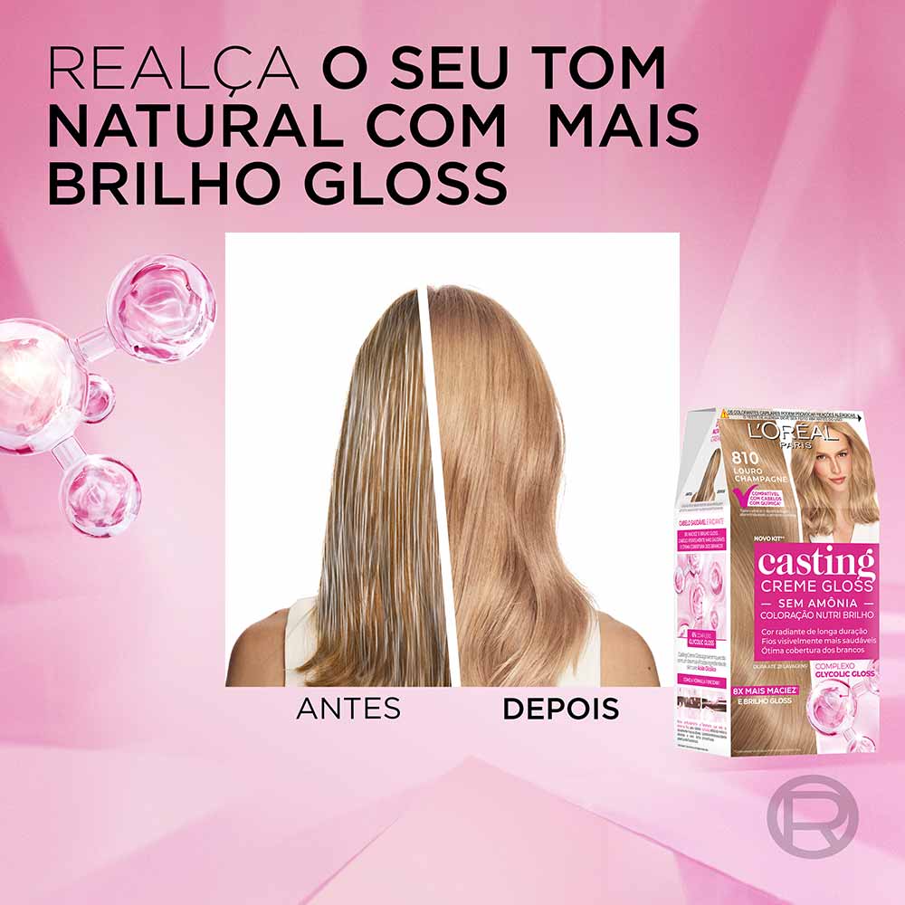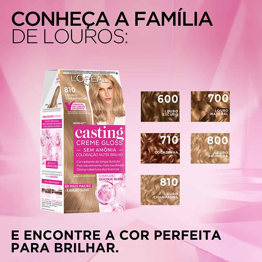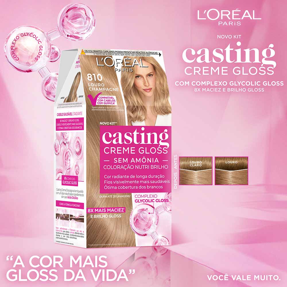 A Coloração Casting Creme Gloss L'Oréal Paris é uma solução inovadora em coloração sem amônia, projetada para proporcionar aos cabelos um brilho gloss incomparável e cor vibrante. Esta coloração não resseca os fios e é ideal até mesmo para cabelos com química. Após o processo de coloração, o tratamento enriquecido com Geleia Real nutre profundamente a fibra capilar, conferindo maciez, sedosidade e um toque aveludado.