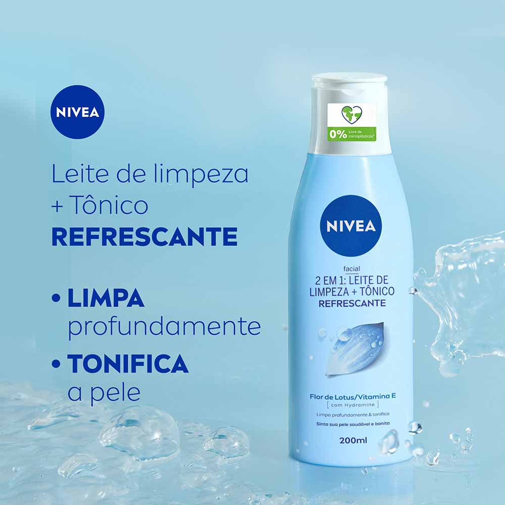 NIVEA Loção 2 em 1 - Leite de Limpeza Facial + Tônico Refrescante é um produto de limpeza facial que combina leite de limpeza e tônico em um só.