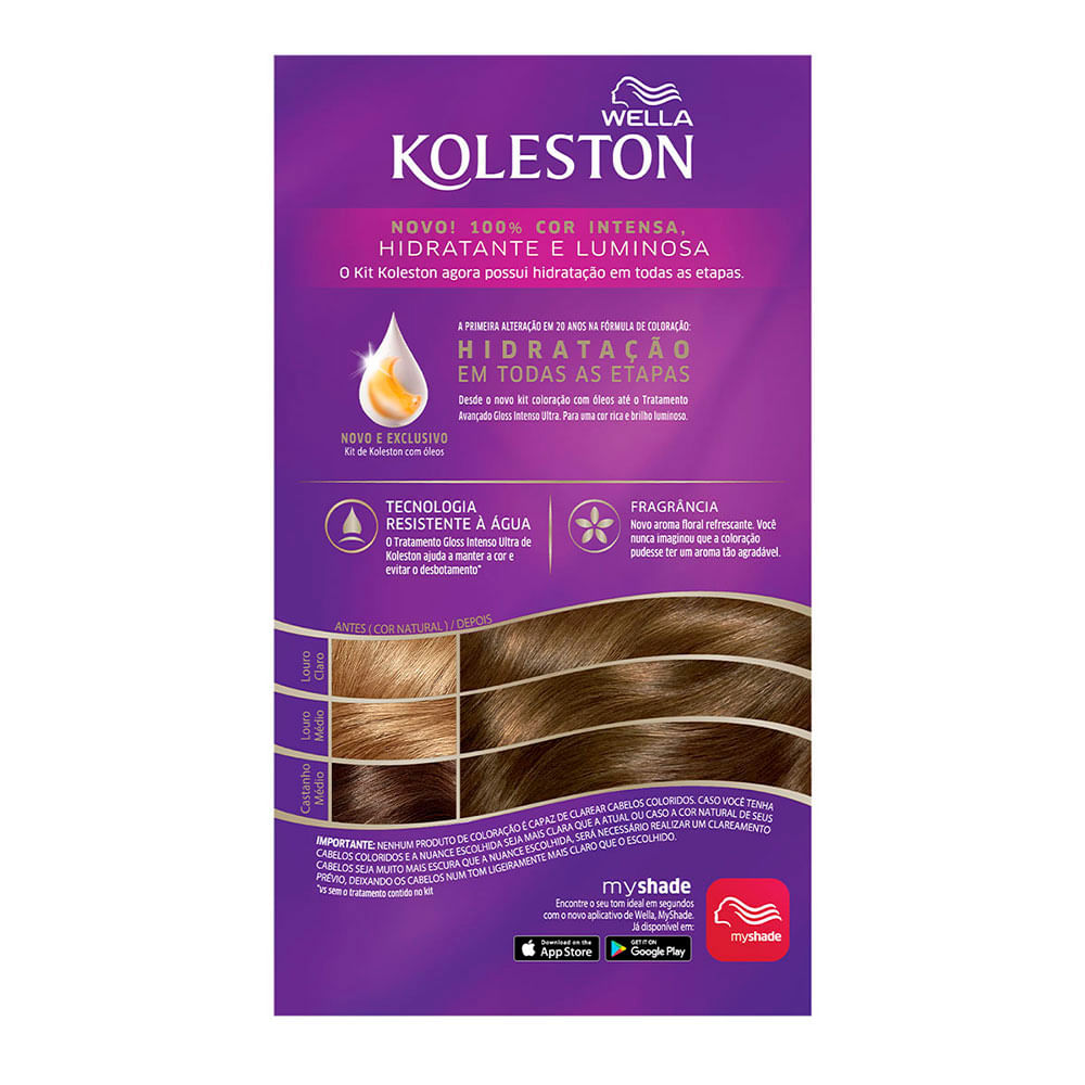 Desenvolvida para quem procura uma coloração permanente e de cor intensa e duradora, a Coloração Creme Koleston da Wella, oferece 100% da cobertura dos fios brancos, graças a tecnologia resistente à água. Seu exclusivo Tratamento Gloss Intenso deixa o cabelo com mais brilho, maciez e ajuda a manter a intensidade da cor. Além disso, o Kit Koleston vem com o Reativador de Cor que deposita mais pigmentos no seu cabelo para manter a cor mesmo depois de 15 dias. A tintura é de fácil aplicação e você pode tingir seus fios sozinha em casa. O kit Koleston contém: • 1 bisnaga Wella Koleston Coloração Creme 55 g • 1 frasco aplicador Wella Koleston Emulsão Reveladora/Água Oxigenada 20 vol. 55 ml • 1 sachê Wella Koleston Reativador de Cor Tratamento com pigmentos 22 ml • 1 tubo Wella Koleston Tratamento Gloss Intenso que contém 4 aplicações 40 ml • 2 pares de luvas • 1 folheto explicativo Benefícios: - Cor intensa e duradoura - Cobertura perfeita dos fios brancos - Fácil de aplicar - Promove hidratação e nutrição - Garante brilho, maciez e um toque suave - Cria camada de proteção que impede que a água penetre no fio, para que não desbote.