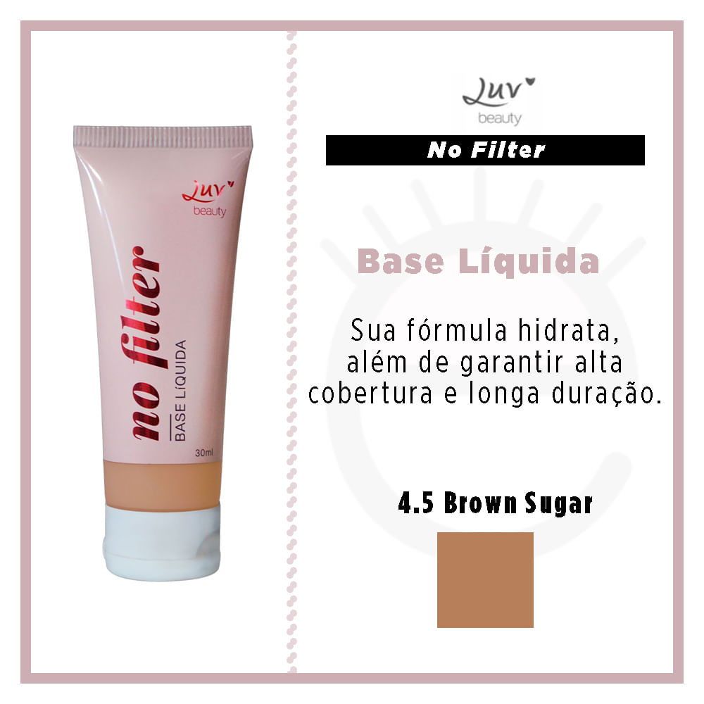 Adeus aos filtros do Instagram! Com a base líquida No Filter da Luv Beauty você não vai mais precisar usar filtros, sua pele vai ficar perfeita nas fotos e ao vivo, claro! A sua fórmula hidrata, além de garantir alta cobertura e longa duração. A textura leve facilita a aplicação e a criação de camadas, chegando assim, no efeito desejado, uma cobertura mais leve ou alta. Livre de óleos, o acabamento é matte e aveludado. A pele fica natural e ao mesmo tempo com ótima cobertura. Indicação: Ideal para todos os tipos de pele. Principais benefícios: • Com ácido hialurônico • Hidrata a pele sem pesar • Secagem rápida • Livre de óleos • Efeito mate aveludado de longa duração • Textura leve e fácil de espalhar • Cores versáteis e inclusivas Modo de Usar: Agite antes de usar. Aplique pequenas quantidades e com um pincel de cerdas sintéticas espalhe com movimentos suaves e circulares. Se desejar, aplique mais de uma camada para aumentar a cobertura. Sobre a Marca: A Luv Beauty foi criada em 2013 com o intuito de ser uma marca focada em pincéis de maquiagem profissionais de alta qualidade. Nos últimos anos, complementamos a linha com maquiagem e estamos sempre em busca de novidades e lançamentos. Nossos produtos são desenvolvidos por uma equipe de especialistas e maquiadores que pensam em cada detalhe com muito cuidado e carinho, desde a escolha das melhores matérias-primas, cores até o design e apresentação final do produto. Tudo para que nossos clientes explorem, ao máximo, a sua própria beleza, através da maquiagem.