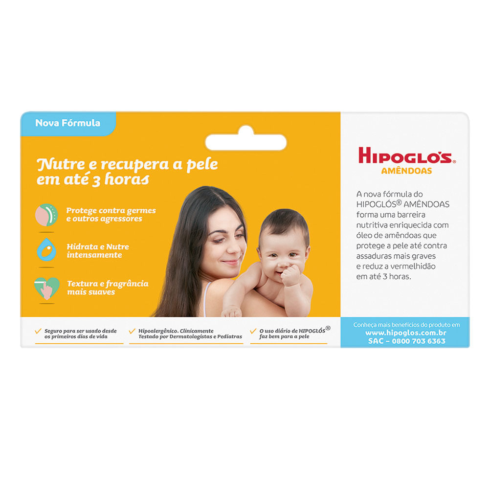 A fórmula do Hipoglós AMÊNDOAS forma uma barreira nutritiva enriquecida com óleo de amêndoas que protege a pele até contra assaduras mais graves e reduz a vermelhidão em até 3 horas. Hipoglós Amêndoas. Produto cosmético para prevenir assaduras. Benefícios: - Protege contra assaduras formando uma barreira contra germes e outros agressores - Nutre e recupera a pele em até 3 horas - Com óleo de Amêndoas e manteiga de Karité - Seguro para ser usado desde os primeiros dias de vida - Hipoalergênico. Clinicamente testado por Dermatologistas e Pediatras - Barreira Branca em Textura Suave Indicação: A fórmula do Hipoglós AMÊNDOAS é indicada para nutrir e proteger a pele até contra assaduras mais graves. Instruções de Uso: A cada troca de fraldas, limpe e seque cuidadosamente a pele do bebê e aplique uma camada generosa de Hipoglós sobre a área a proteger, massageando suavemente. Precauções: Mantenha fora do alcance de crianças. Deve ser aplicado por adulto ou sob sua supervisão. Não usar na pele irritada ou ferida. Em caso de irritação, suspender o uso e procurar um médico. Conservar em local seco, fresco e ao abrigo da luz solar direta. Este produto foi formulado de maneira a minimizar possível surgimento de alergia. Sobre a marca:: A Johnson & Johnson do Brasil iniciou suas atividades em 1933, no bairro da Mooca, em São Paulo. À época, a companhia tinha como principal objetivo suprir o mercado brasileiro com produtos de uso hospitalar e doméstico, como algodão, gaze, esparadrapo, compressas cirúrgicas, entre outros. Com o passar dos anos, foram ganhando um DNA especialmente brasileiro que refletiu-se em descobrir as necessidades deste mercado, trazendo inovação, investindo em infraestrutura e apostando nas particularidades do país.