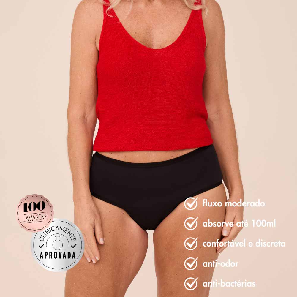 Calcinha absorvente Dry - incontinência urinária moderada Indicada para incontinência urinária moderada, a calcinha absorvente reutilizável Dry traz conforto e segurança contra os escapes de urina. A Dry possui tecidos super tecnológicos, super absorventes, de secagem rápida, impermeáveis, respiráveis, anti-bactérias e anti-odores, que absorvem até 100ml de urina, substituindo completamente os absorventes descartáveis. Seu exterior é todinho feito em modal preto - tecido 100% natural, super macio ao toque, muito confortável e respirável como o algodão - mas muito mais sustentável porque usa menos água em sua produção - além disso, regula a temperatura e a umidade. Seu forro tem camadas super absorventes para você se sentir segura e tranquila. Ah, e claro, também é biodegradável - após o descarte, se reintegra completamente na natureza em apenas 6 meses. Além de ser neutra em carbono e vegana. Melhor para você. Melhor para o planeta. Como higienizar as peças? à mão, no banho ou na máquina de lavar com sabão neutro ou de coco e mais nada. Não use água quente, alvejante ou amaciante, ok?