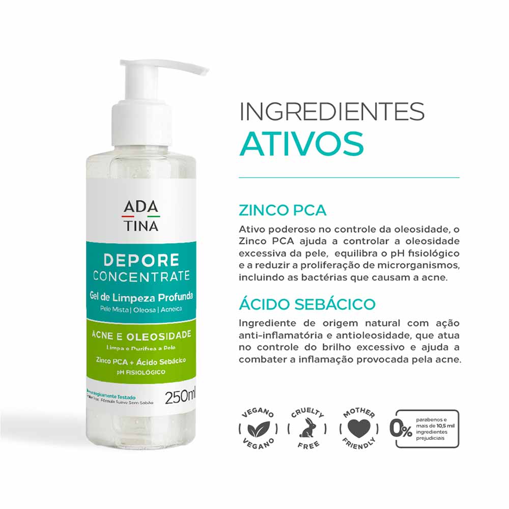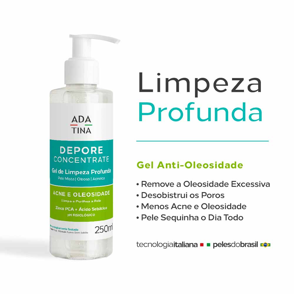 O Gel de Limpeza Facial Ada Tina Depore Concentrate é um dermocosmético especialmente formulado para promover uma limpeza profunda, eficaz e segura em peles oleosas, mistas e acneicas.