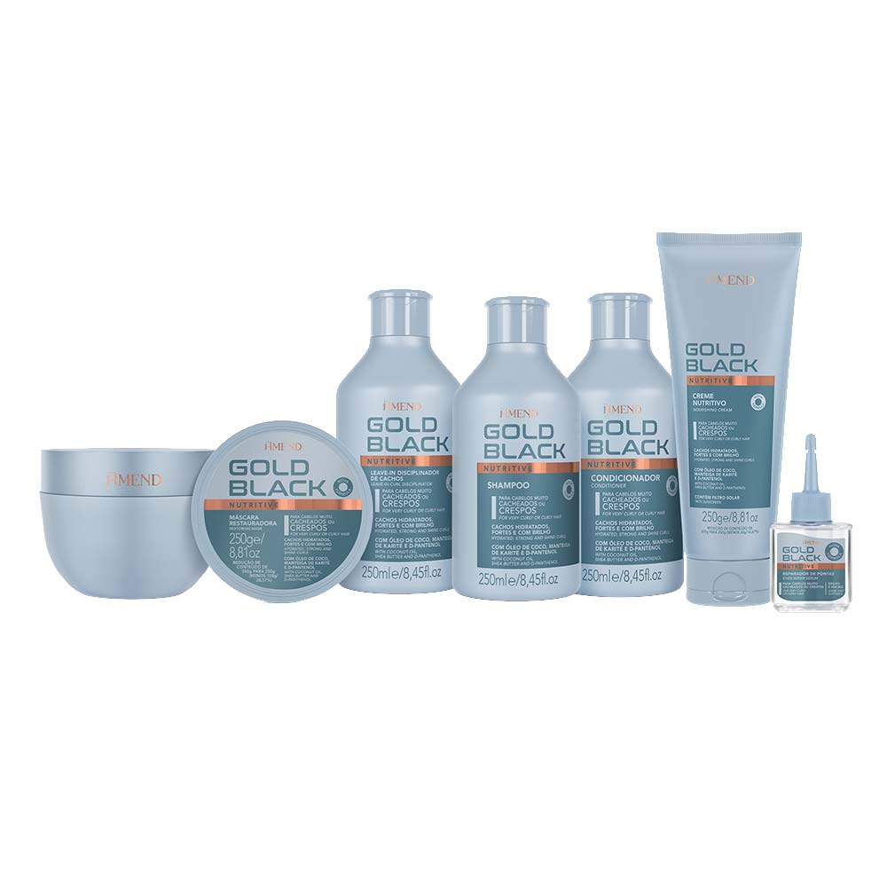Condicionador Nutritivo Amend Gold Black Nutritivo - O Condicionador Nutritivo Amend Gold Black foi formulado com ativos essenciais para um condicionamento intenso dos fios, garantindo hidratação na medida certa para o cachos e ajudando a reduzir o volume. Sua fórmula enriquecida com ativos emolientes fortalece e diminui a porosidade dos fios, proporcionando maior maciez, brilho e suavidade ao cabelo. Indicação: Ressecados, desidratados e opacos. Princípios Ativos: Manteiga de Karité + Óleo de Avelã + Pró Vitamina B5. Ação: Condicionamento intenso dos fios, garantindo hidratação na medida certa para os cachos e ajudando a reduzir o volume. Principais Benefícios: Hidrata os Cachos na medida certa; Reduz a porosidade, o volume e o frizz; Mantém os cachos macios, controlados e definidos por todo o dia; Fortalece os fios minimizando a quebra. Modo de Uso: Após lavar o cabelo com o Shampoo, aplique o Condicionador Nutritivo do comprimento dos fios até as pontas, massageando suavemente. Deixe agir por 03 minutos e enxágue. Precauções: Mantenha fora do alcance de crianças, em lugar fresco e ao abrigo de luz intensa. Não ingerir. Em caso de contato com os olhos, enxaguar imediatamente com água abundante. USO EXTERNO.