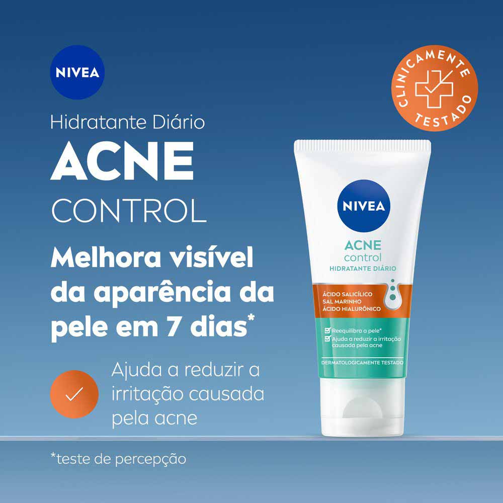 O que é? Nova linha de Acne Control da NIVEA apresenta este hidratante facial que reduz a acne e melhora visível da aparência da pele em apenas 7 dias. Ajuda a reduzir a irritação causada pela acne. Para que serve o NIVEA Hidratante Facial Acne Control? Reduz a acne e ajuda a reequilibrar a pele de 5 maneiras: 1. Ajuda a combater 99% da bactéria causadora da acne; 2. Controla a oleosidade e proporciona efeito matte; 3. Com ácido salicílico que ajuda a remover células mortas; 4. Ajuda a reduzir a vermelhidão da acne 5. Sensação de pele hidratada. Benefícios e diferenciais: - Ajuda a combater 99% da bactéria causadora da acne - Ajuda a reduzir a irritação causada pela acne - Sal marinho 99% puro - Ácido Salicílico: ajuda a remover células mortas - Extrato de Alcaçuz Dourado e Magnólia - Carnitina: ajuda a controlar a oleosidade - Ácido Hialurônico: ajuda na hidratação da pele Como usar o NIVEA Hidratante Facial Acne Control? USO DIÁRIO Aplique diariamente no rosto limpo. Utilize duas vezes ao dia. CUIDADO: Evite contato com os olhos. Uma unidade de embalagem contém 50ml. Sobre a Marca: DIFERENTES TIPOS DE PELE. DIFERENTES NECESSIDADES. Há mais de cem anos inventamos o cuidado moderno da pele com o NIVEA Creme. Hoje, milhões de pessoas em todo o mundo, com diferentes tipos de pele, confiam na marca NIVEA. É por esta razão que nossos investigadores trabalham arduamente com a individualidade da pele humana e as diferentes necessidades de cuidado que surgem em função da cultura, do s e x o e da idade. Seguindo esta abordagem, nas últimas décadas nós desenvolvemos inúmeros produtos inovadores de cuidado da pele — desde desodorizantes a produtos de proteção solar. Fazemos isso para que um dia todas as pessoas do mundo possam depositar sua confiança nos produtos NIVEA.