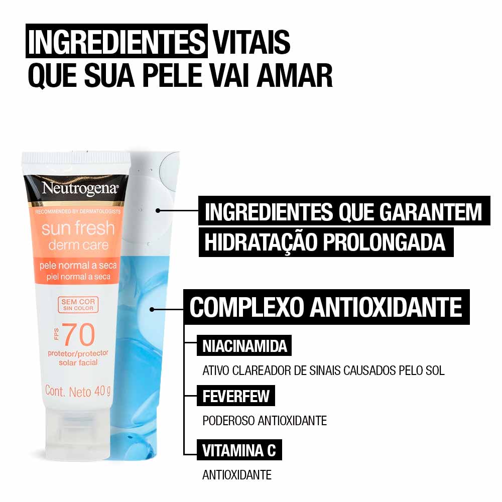 Protetor Solar Facial Para Pele Seca NEUTROGENA SUN FRESH Derm Care Sem Cor FPS 70, 40g possui textura ultraleve e hidratante que não derrete e oferece alta proteção contra os raios UVA, UVB e ajuda a proteger contra a luz visível com sua exclusiva tecnologia HELIOPLEX® XP.