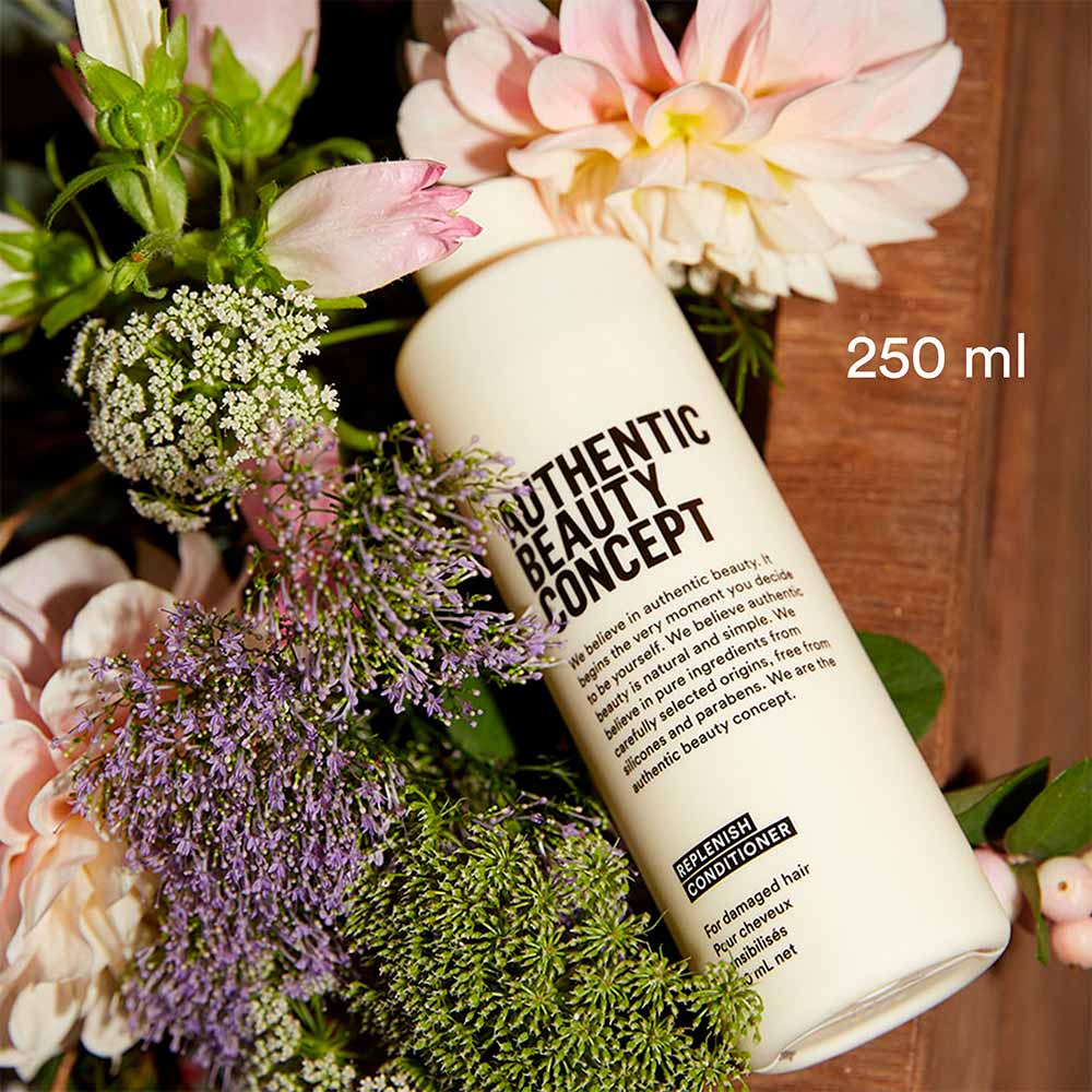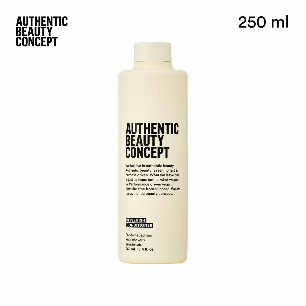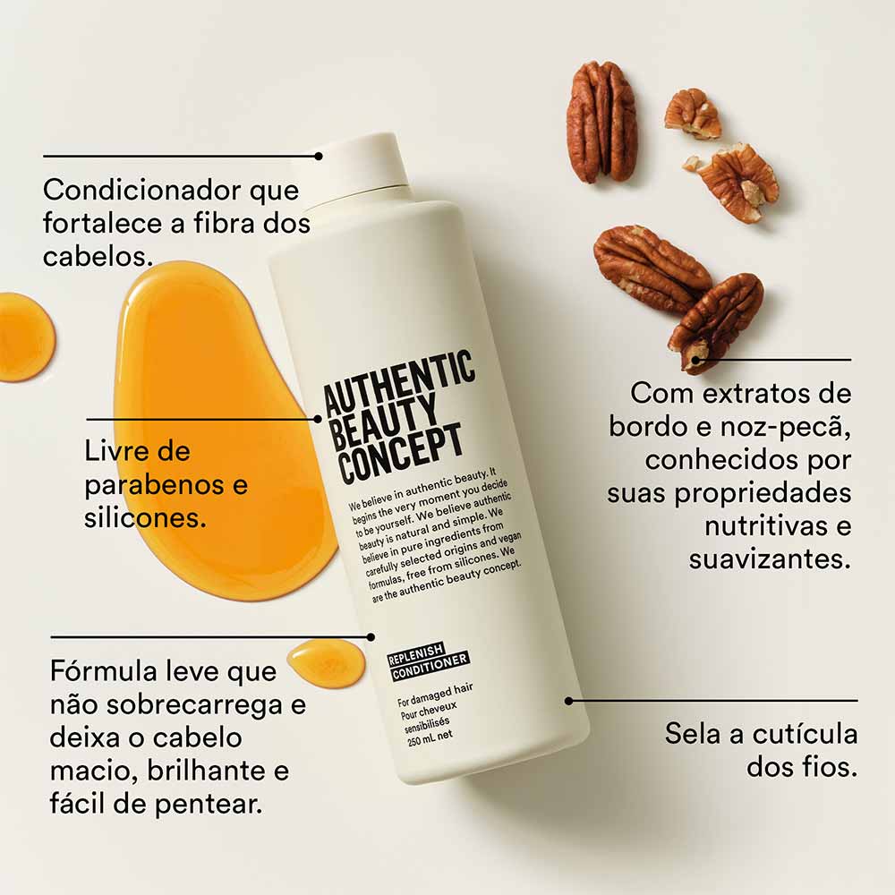 Condicionador Authentic Beauty Concept Replenishajuda a selar os fios e fortalecer a integridade da fibra capilar. Apresenta fórmula vegana, de consistência espessa e formulado com Pantenol, proporciona aos fios mais brilho, movimento e maciez sem deixar a aparência pesada. Indicado: Para cabelo danificado. Modo de uso: Aplique o produto no comprimento e pontas, após a limpeza com shampoo, no cabelo úmido e limpo. Deixar agir por até 2 minutos. Enxague abundantemente. A linha Authentic Beauty Concept Replenish possui formulações veganas e livres de Surfactantes de Sulfato, Parabenos e Silicones. Sua composição é enriquecida com Proteína de Soja Hidrolisada, responsável por suavizar e nutrir os fios. Além disso, apresenta consistência espessa e é formulado com Pantenol, que proporciona aos fios mais brilho, movimento e maciez sem deixar a aparência pesada. Somos certificados pela PETA Estamos orgulhosos de ser oficialmente certificados pela PETA e continuaremos a apoiar o compromisso da nossa marca de fornecer fórmulas veganas para cuidados com o cabelo e estilo. Sobre a marca: A Authentic Beauty Concept é uma marca que acredita na beleza autêntica de cada pessoa. Cocriada em parceria com os melhores cabeleireiros e artistas que compartilham os mesmos valores. Seus produtos apresentam fórmulas ricas em ativos naturais, extraídos através de tecnologia que preserva seus principais benefícios. Destaque suas características e valorize o que é de mais bonito e único em você, afinal, para Authentic Beauty Concept, beleza não é um valor universal, mas abraçar o seu estilo autêntico e individual.