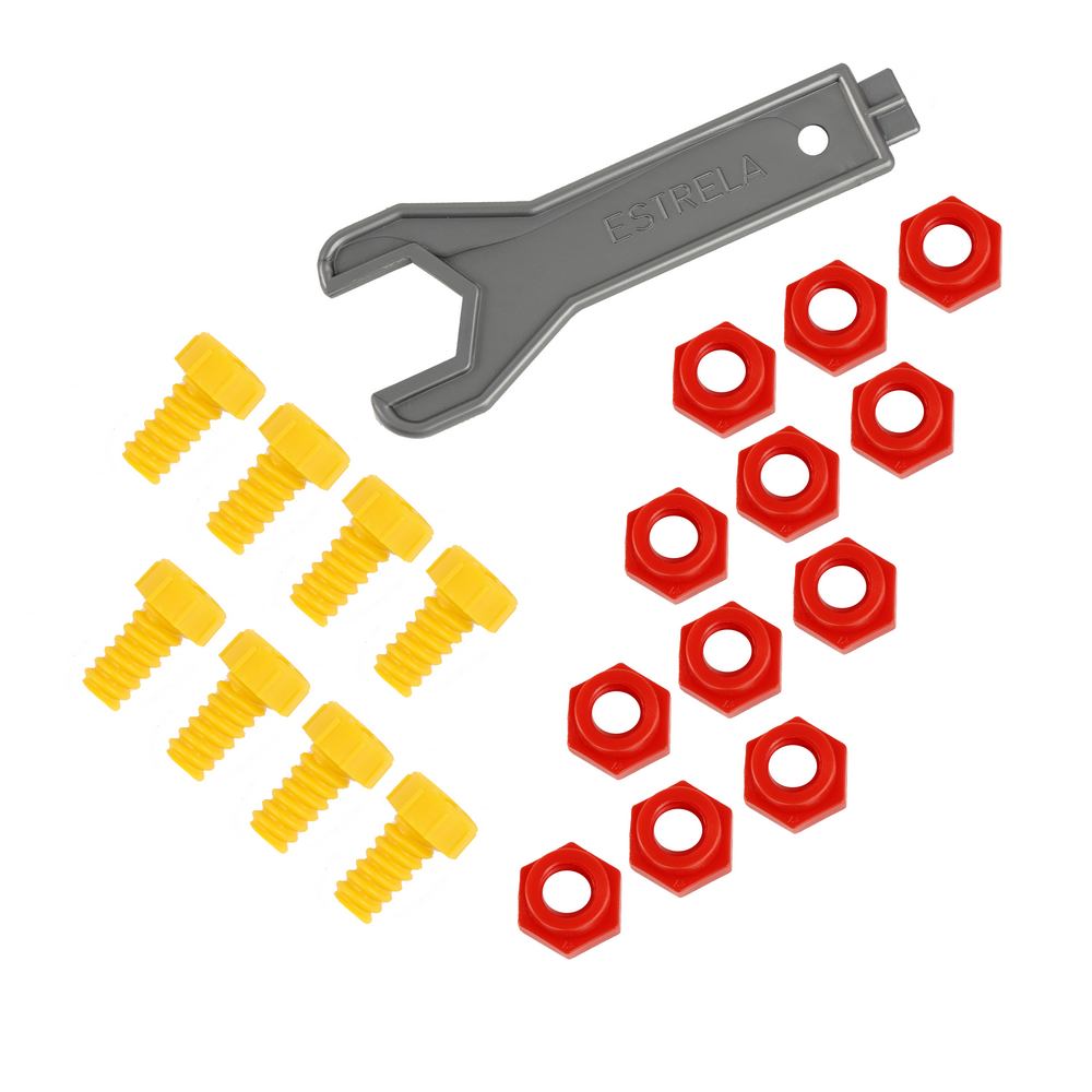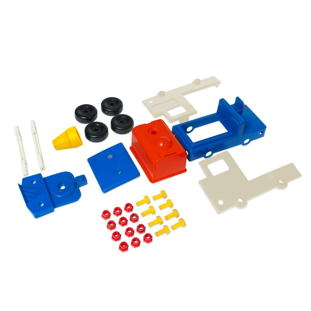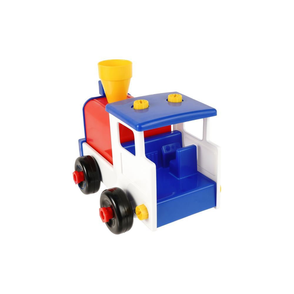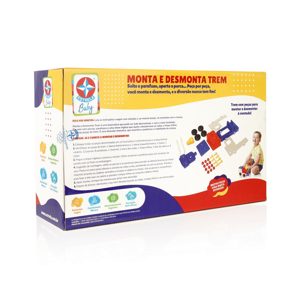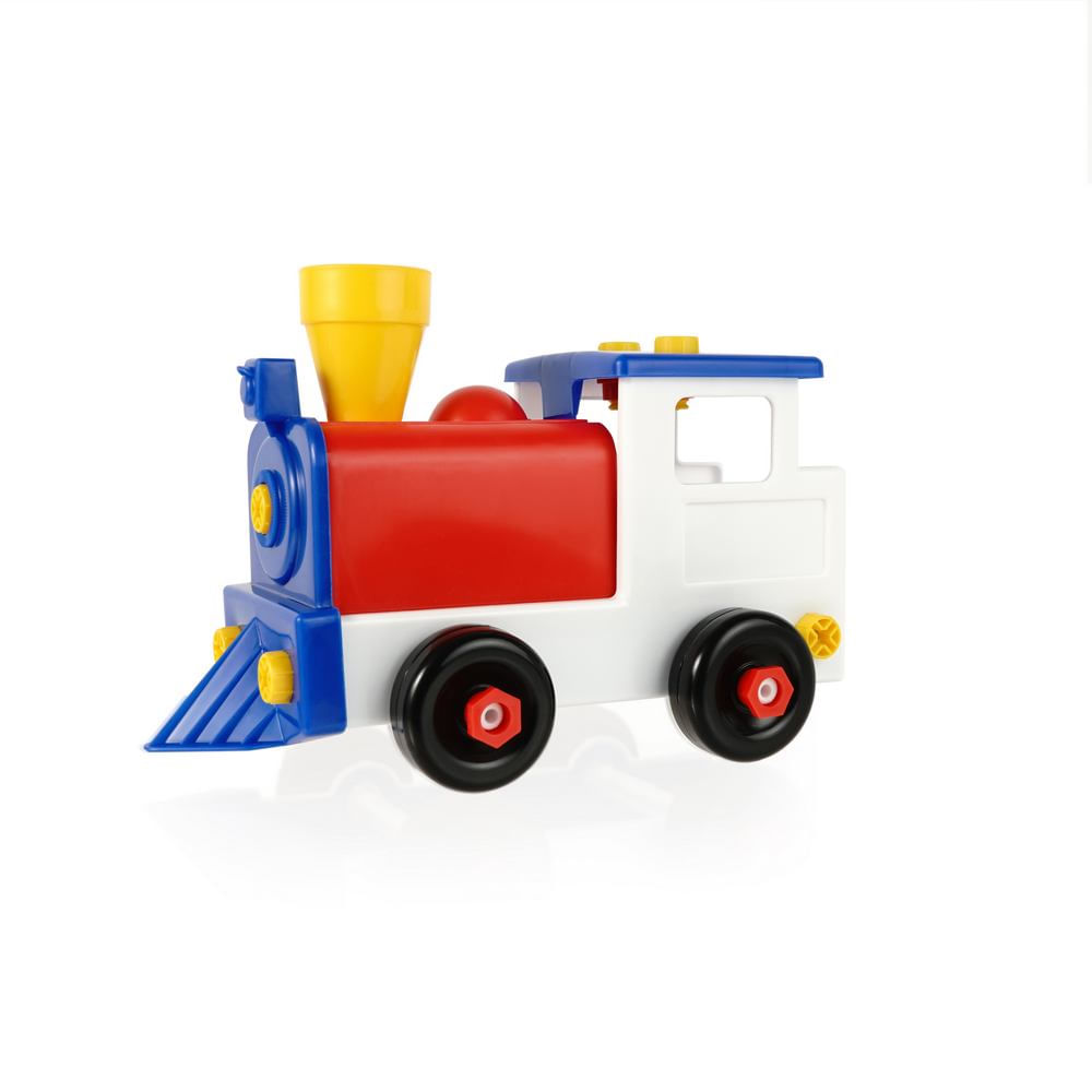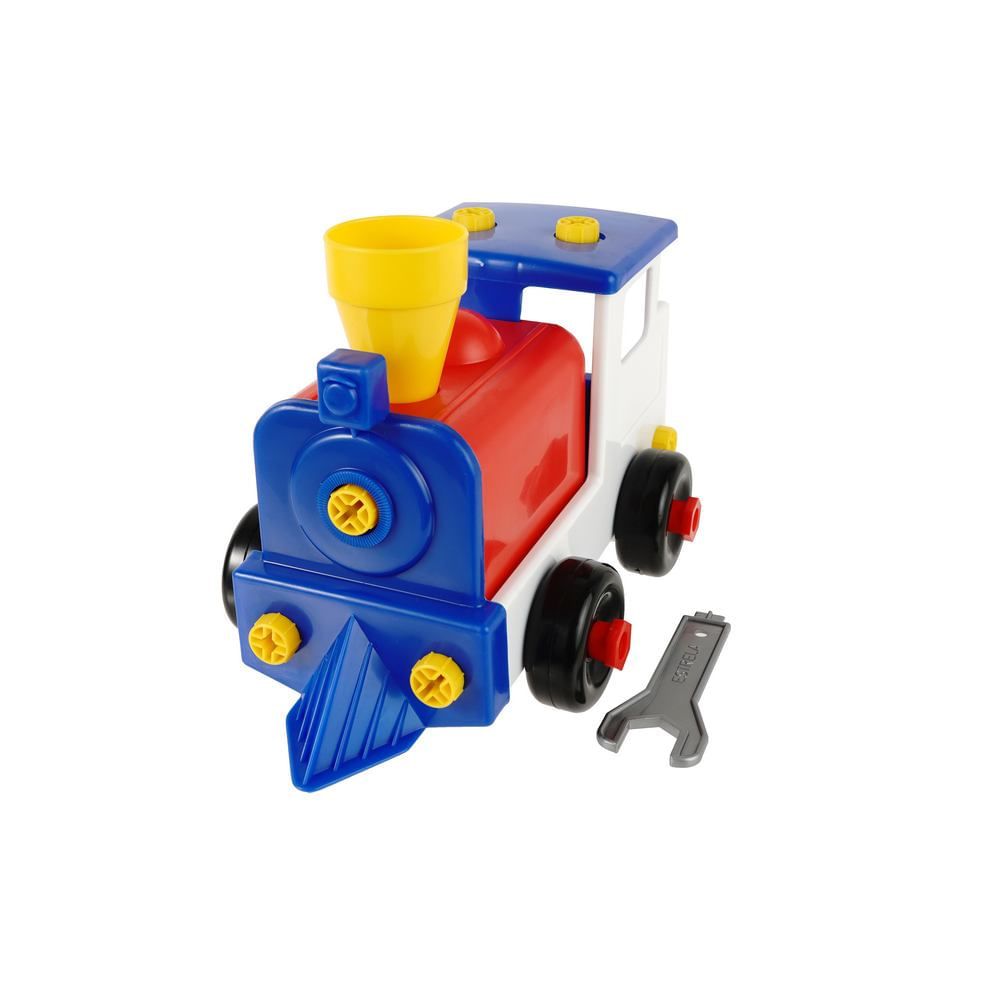 Um trem para a criança montar e desmontar peça por peça quantas vezes desejar, com auxílio de ferramenta, virando um carro de roda livre.
