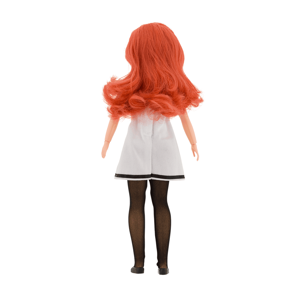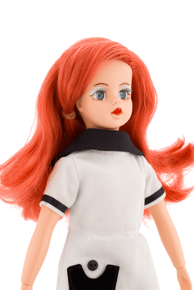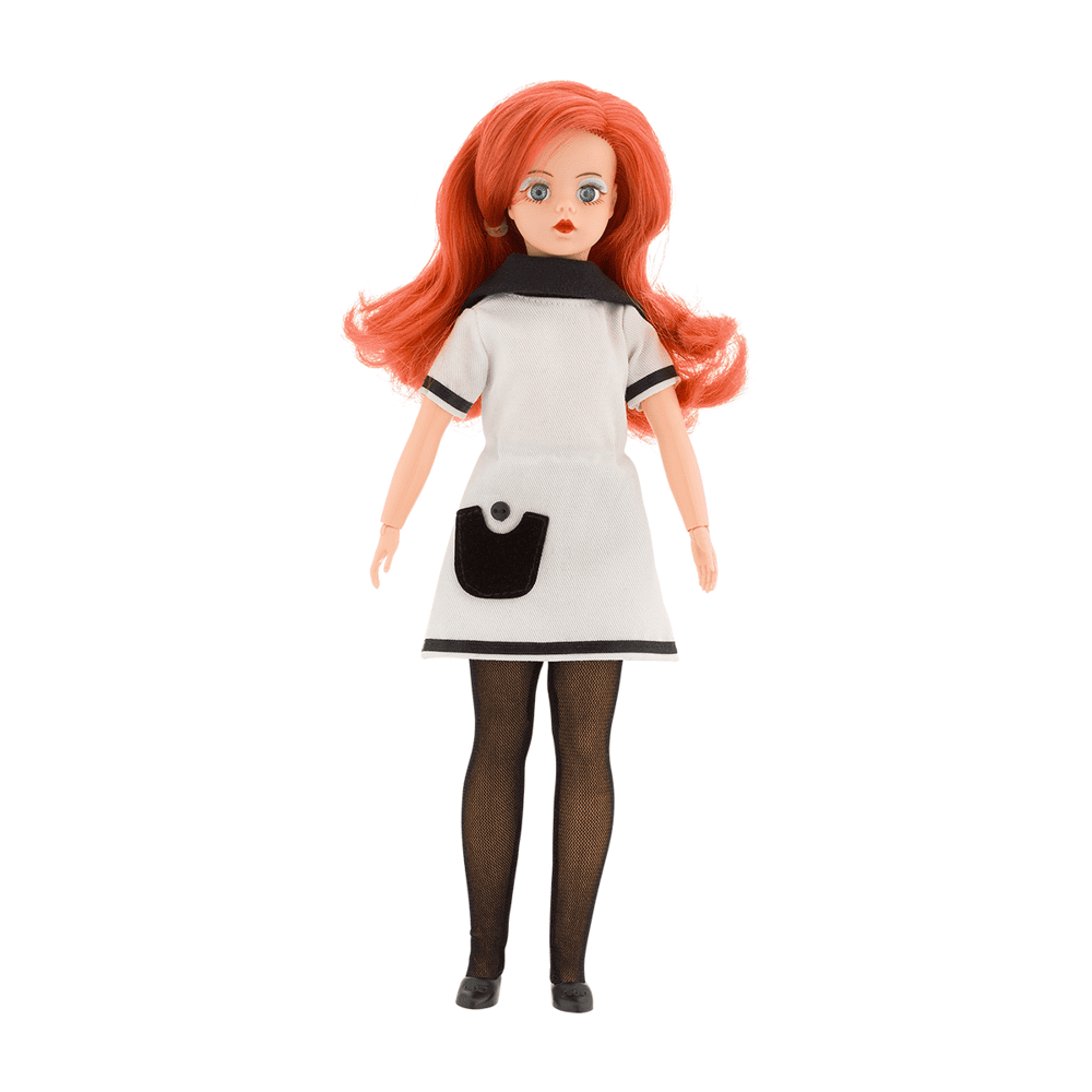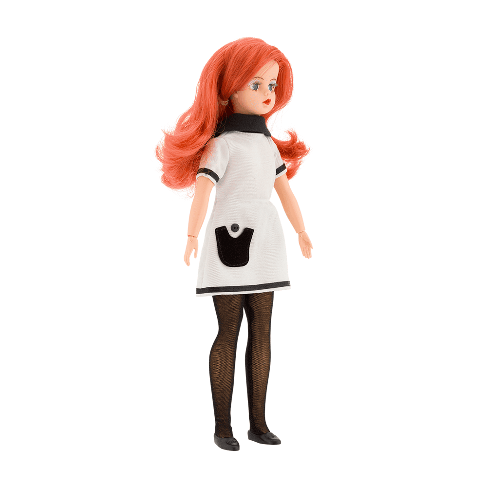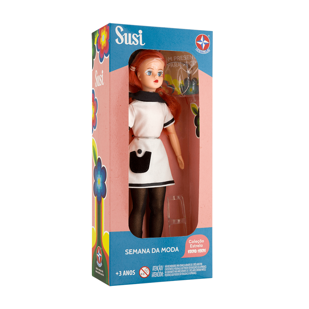A Susi voltou! Nossa boneca mais querida está de volta com um relançamento de 1970/71, usando um vestido branco com bolso e detalhes em preto, uma meia calça preta e uma sapatilha também preta.