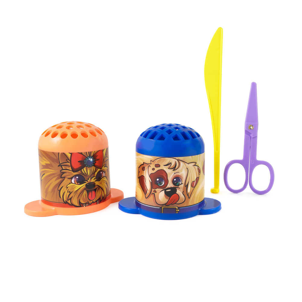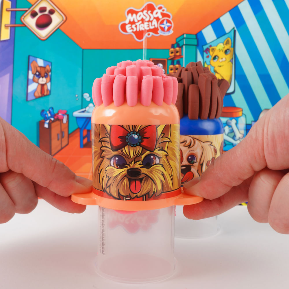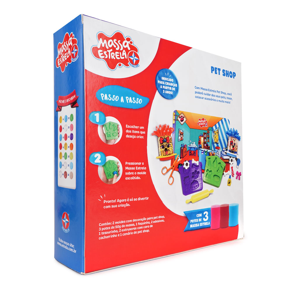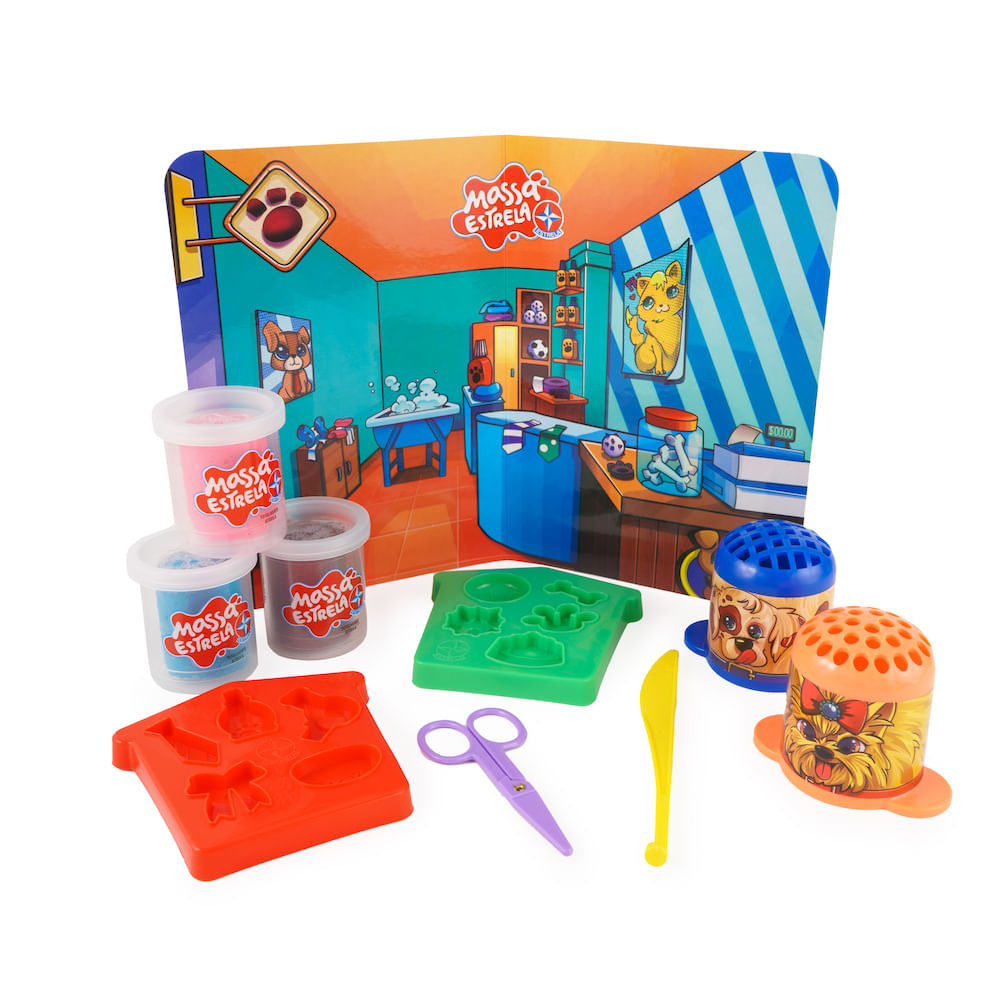 O Pet Shop com Massa Estrela vem com duas extrusoras com adesivos de cachorrinhos, 3 potes de massa de 50g e moldes de acessorios para pets, como bola, osso, pote de ração, lacinho, gravtinha, secador, shampoo e sabonete. Acompanha também rolinho e tesoura para a massa.