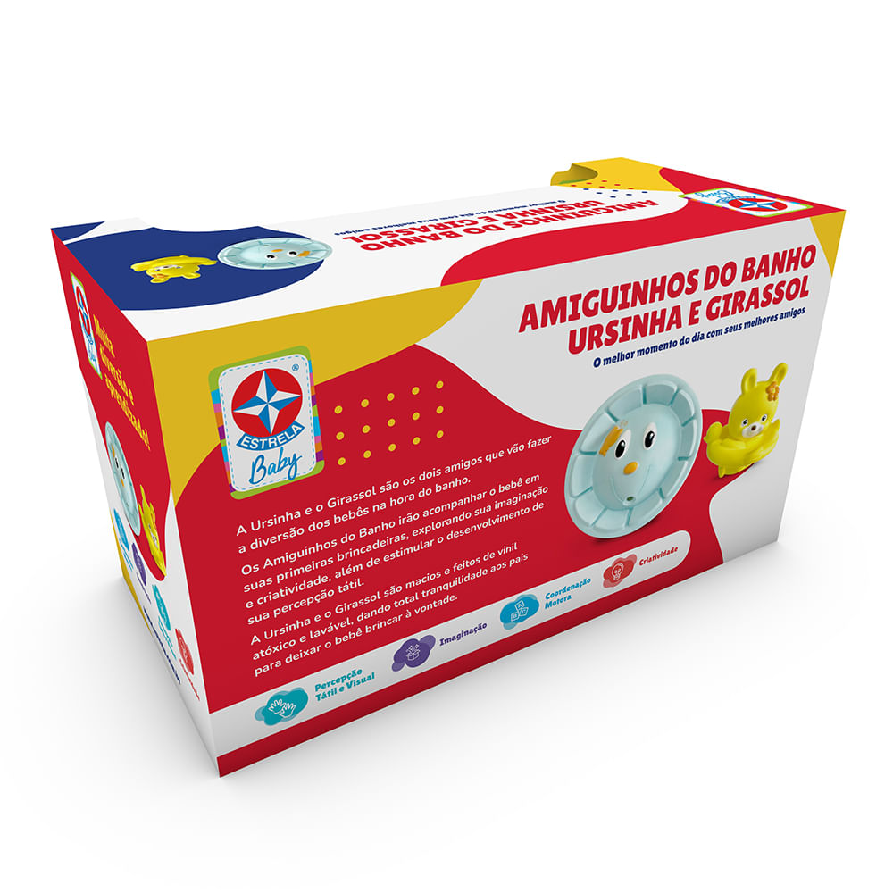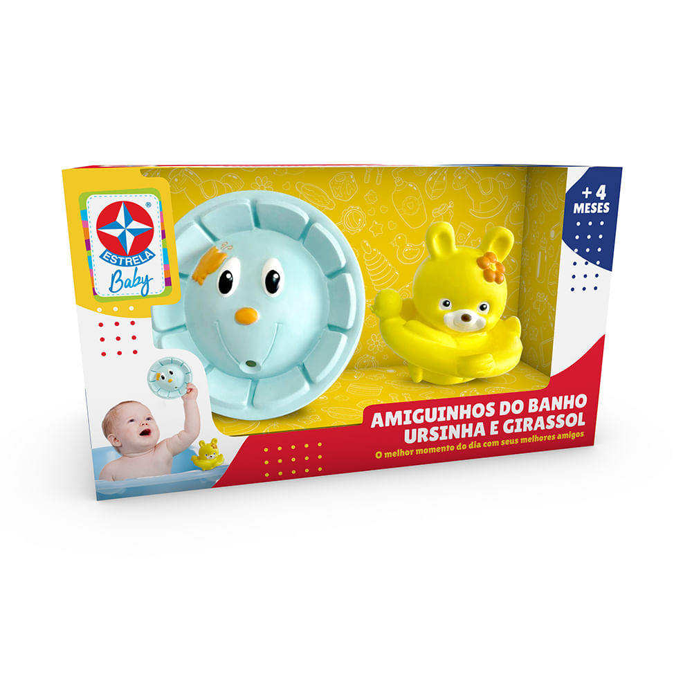 Amiguinhos do Banho é um kit de banho composto por 2 personagens de vinil decorados: a Ursinha e o Girassol. Com eles, a criança poderá brincar dentro ou fora do banho. O melhor momento do dia com seus melhores amigos!