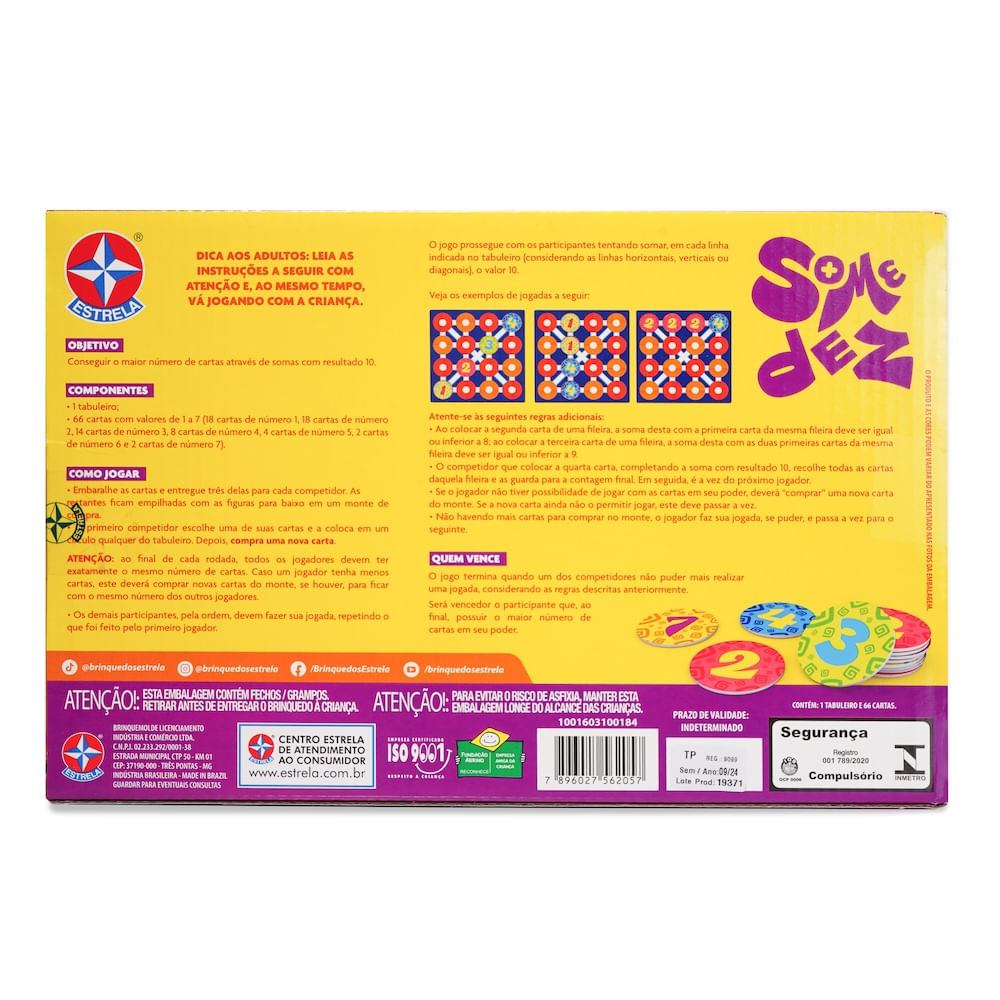 Um jogo divertido, dinâmico e estratégico. Cada jogador deve ter 3 cartas numeradas de 1 a 7 em mãos a todo o momento. Os participantes colocam os números nos espaços vazios a fim formar em cada fileira (horizontais, verticais ou diagonais) o valor total 10 (dez). Ganha aquele que somar 10 mais vezes.