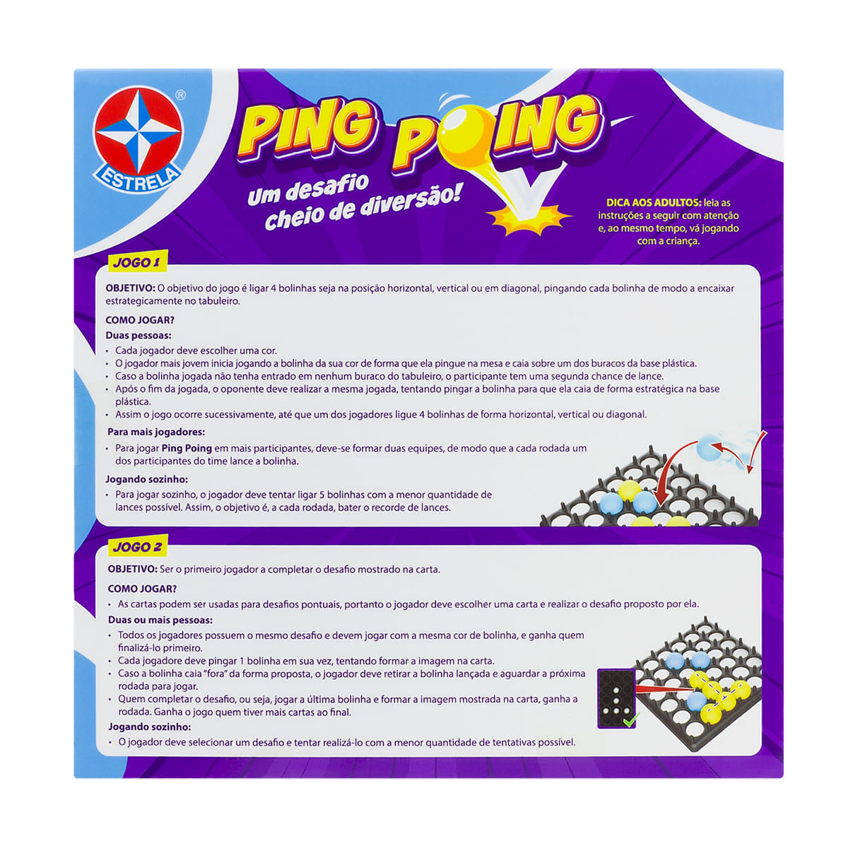 Com muita diversão e estratégia, o Ping Poing tem como objetivo ligar 4 bolinhas da mesma cor - na horizontal, vertical ou diagonal. Utilize suas habilidades para pingar a bolinha e encaixá-la estrategicamente no tabuleiro! Desafie-se sozinho ou enfrente um amigo para ver quem será o campeão do PING POING!