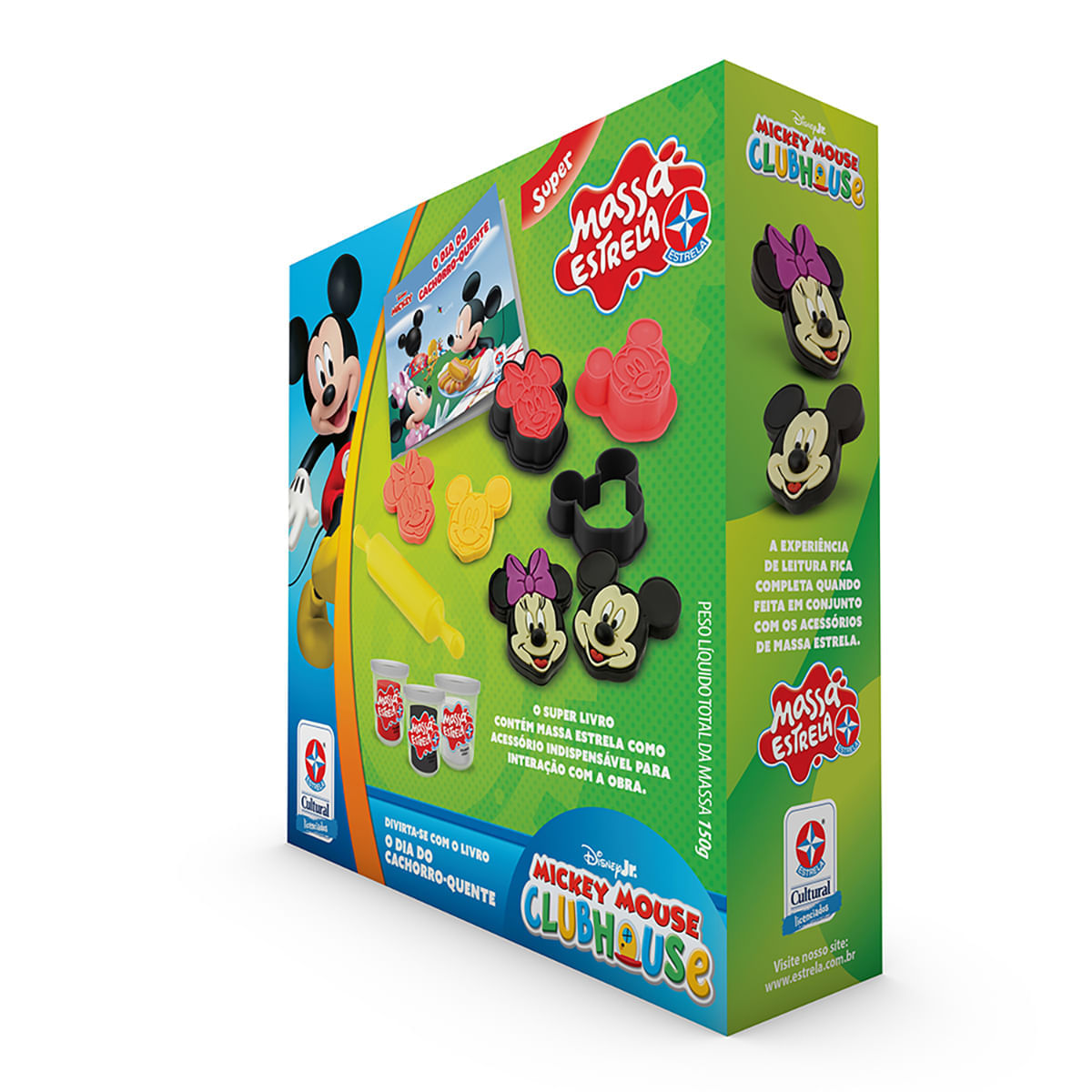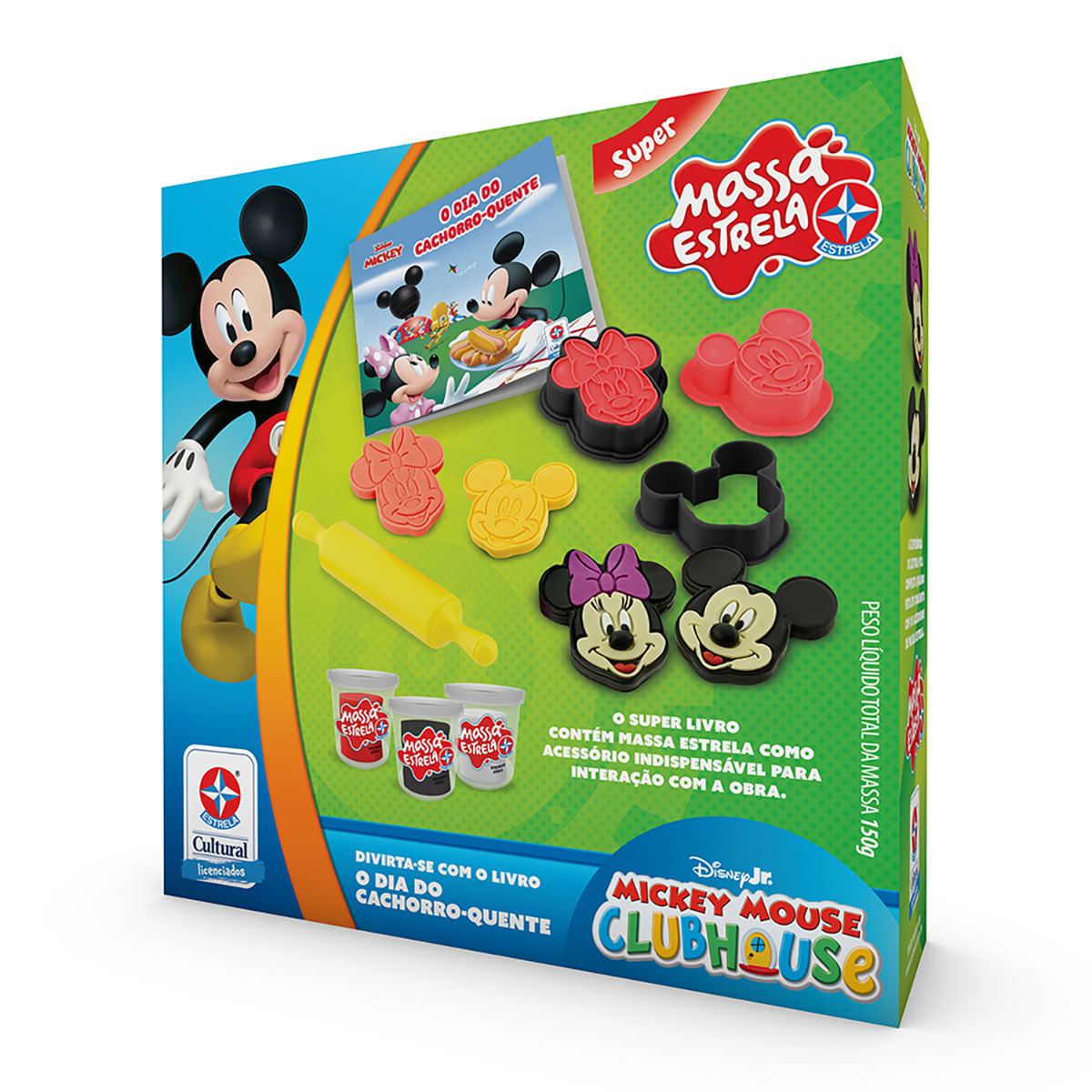 O Livro Mickey: O Dia do Cachorro-Quente, acompanha Mickey e seus amigos em uma aventura em busca dos ingredientes para preparar o piquenique perfeito. Além da história exclusiva, o kit acompanha 2 cortadores e 2 carimbos dos personagens Mickey e Minnie, além de rolinho e 3 potes de 50g de Massa Estrela.